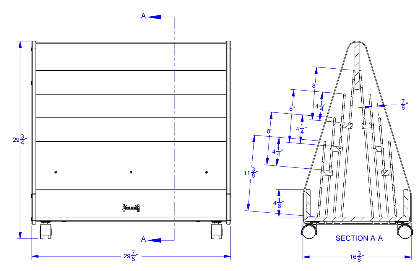 This book stand is just the right size for early-learners. The back is identical to front with for maximum book storage. Each side features four display shelves, with eight total display shelves. Approximately 1" shelf depth. Constructed of double-sided freckled gray laminate with navy TRUEdge.