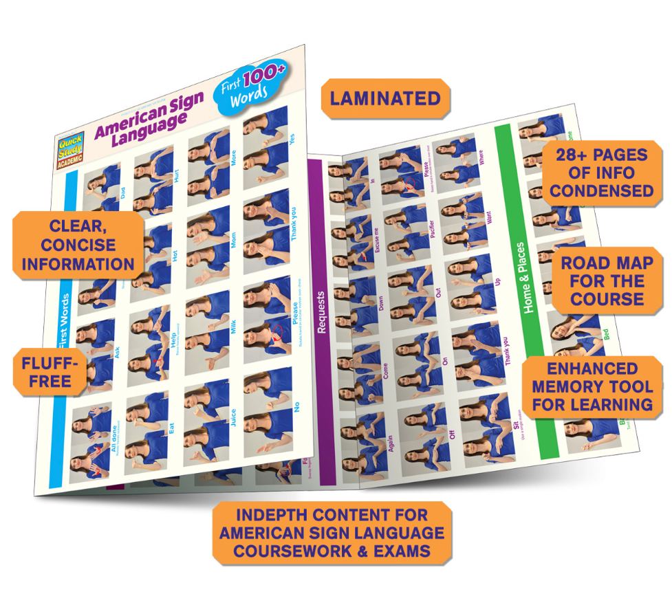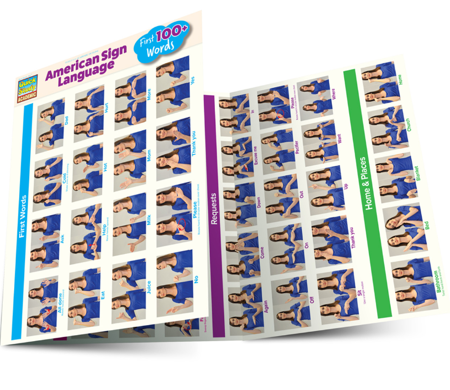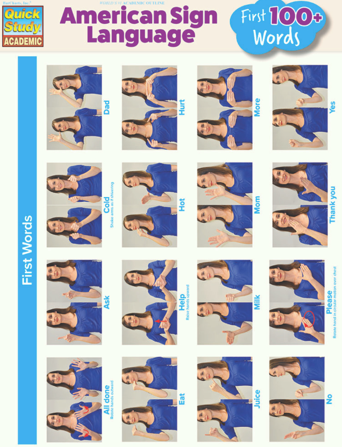 Photos make up this dictionary of 112 essential words for signing with start and finish poses including arrows and directions where necessary. Perfect for parents this 6-page guide includes the first infant and toddler signs and many more any beginner would use. Designed to also hang on the wall it is laminated for durability during heavy use or defense against that splotch of applesauce thrown while signing "more".