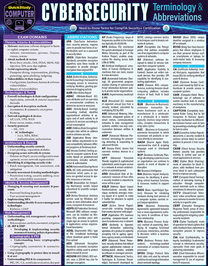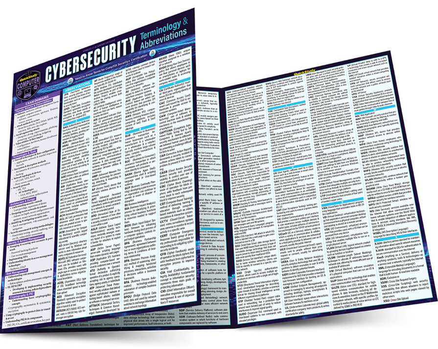 All the essential terminology, abbreviations, and acronyms for cybersecurity you need to know in 6 laminated pages written and designed for quick reference. Great for working professionals and a stellar test-prep tool for CompTIA Security+ certification. Author George Antoniou, PhD, is a professor with 30 years of experience in information security, risk management, and quality assurance compliance as well as strategic planning and enterprise level security architecture, plus security operations and policy development in small-medium-large, national and multi-national complex information security technology infrastructures. Curating this dictionary of words with his experience and providing succinct definitions ensures this guide is a handy and powerful tool. We guarantee you will find answers faster than any book or website for a price that makes it easy to add this to your information toolbox.