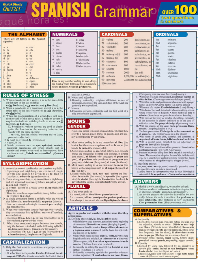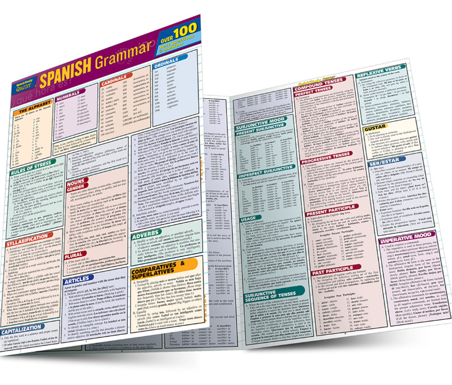 While finding out the difference between present subjunctives, preterites, and indicative moods is tough already, it can be especially baffling when you have to do so in Spanish. Don't be confused any longer this 3-panel Quizzers" edition of our popular Spanish Grammar guide will help clear the air! Each jam-packed page duplicates the easy-to-use format of the original version, with the addition of writing exercises on the back page that test you on the information you've learned.