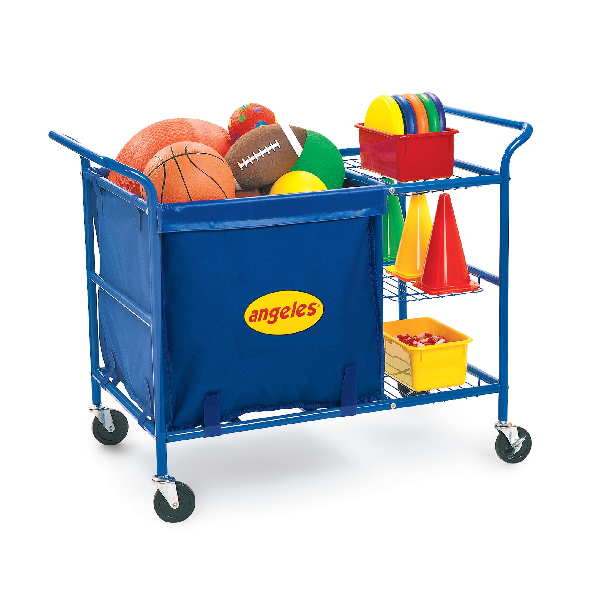Ball Cart stores items of all shapes and sizes conveniently and safely. Cart is constructed of sturdy, steel with an integrated heavy-duty nylon storage bin.
