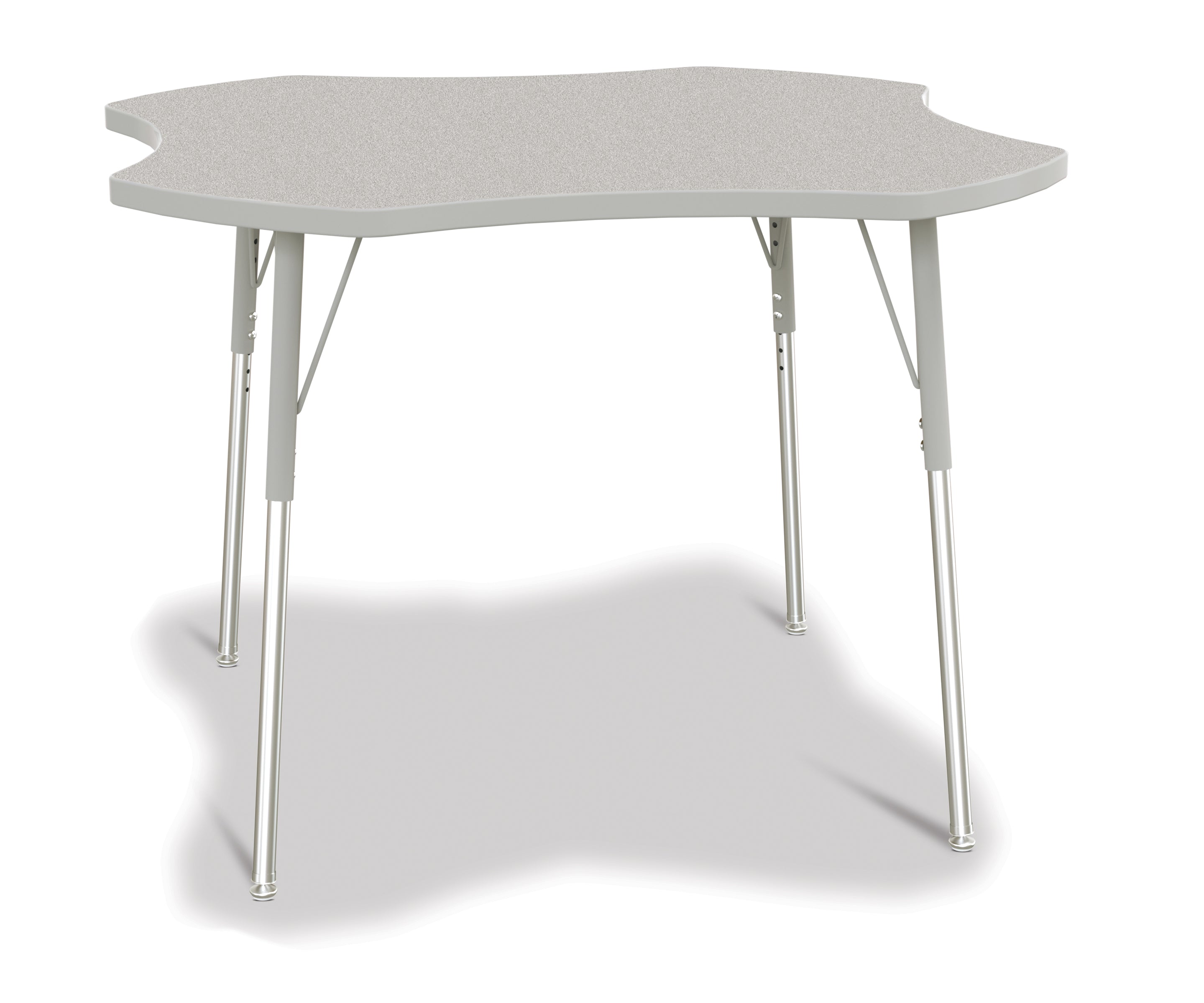 Seating in a fun shape! Accommodates up to 4 chairs. The legs feature glides that reduce noise, prevent snags, and resist rust. Freckled gray laminate tabletop with gray TRUEdge and gray legs.KYDZSafe edges. KYDZStrong construction. TRUEdge. Choose from multiple tabletop and TRUEdge color combinations. Thermally Fused Laminate tabletops 1-1/8â thick. Quick mount legs with minimal assembly. Legs adjust in one-inch increments with the extra-safe dual-screw leg adjustability system. Helpful Hint: Most children require elementary size tables tiny tables typically fit children just 1 to 2 years old. Adjusts from 24" to 31" high. See cleaning recommendations at www.jonti-craft.com/cleaning.Product Height (inches):24-31Product Width (inches):42Product Depth (inches: 42