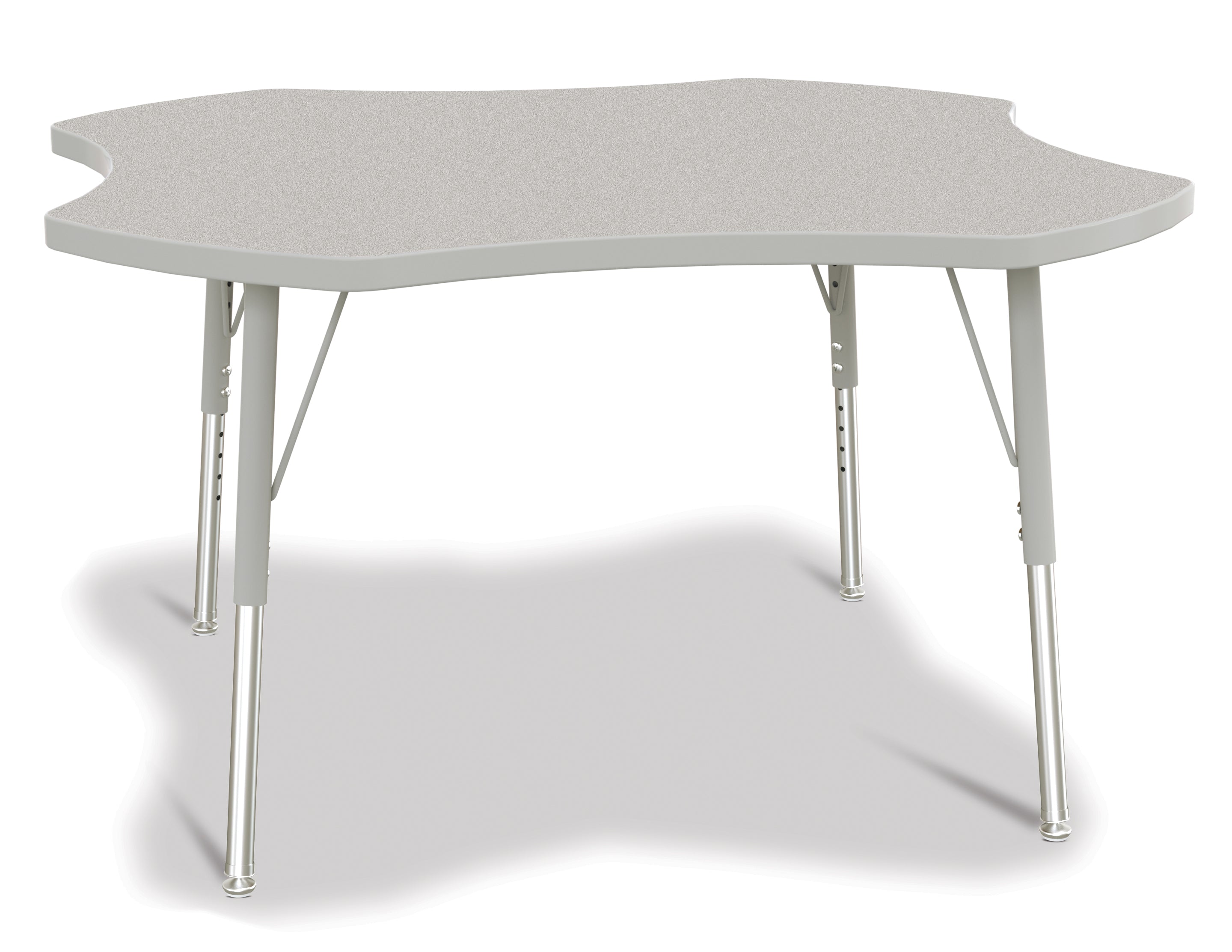 Seating in a fun shape! Accommodates up to 8 chairs. The legs feature glides that reduce noise, prevent snags, and resist rust. Freckled gray laminate tabletop with gray TRUEdge and gray legs.KYDZSafe edges. KYDZStrong construction. TRUEdge. Choose from multiple tabletop and TRUEdge color combinations. Thermally Fused Laminate tabletops 1-1/8â thick. Quick mount legs with minimal assembly. Legs adjust in one-inch increments with the extra-safe dual-screw leg adjustability system. Helpful Hint: Most children require elementary size tables tiny tables typically fit children just 1 to 2 years old. Adjusts from 15" to 24" high. See cleaning recommendations at www.jonti-craft.com/cleaning.Product Height (inches):15-24Product Width (inches):42Product Depth (inches: 42
