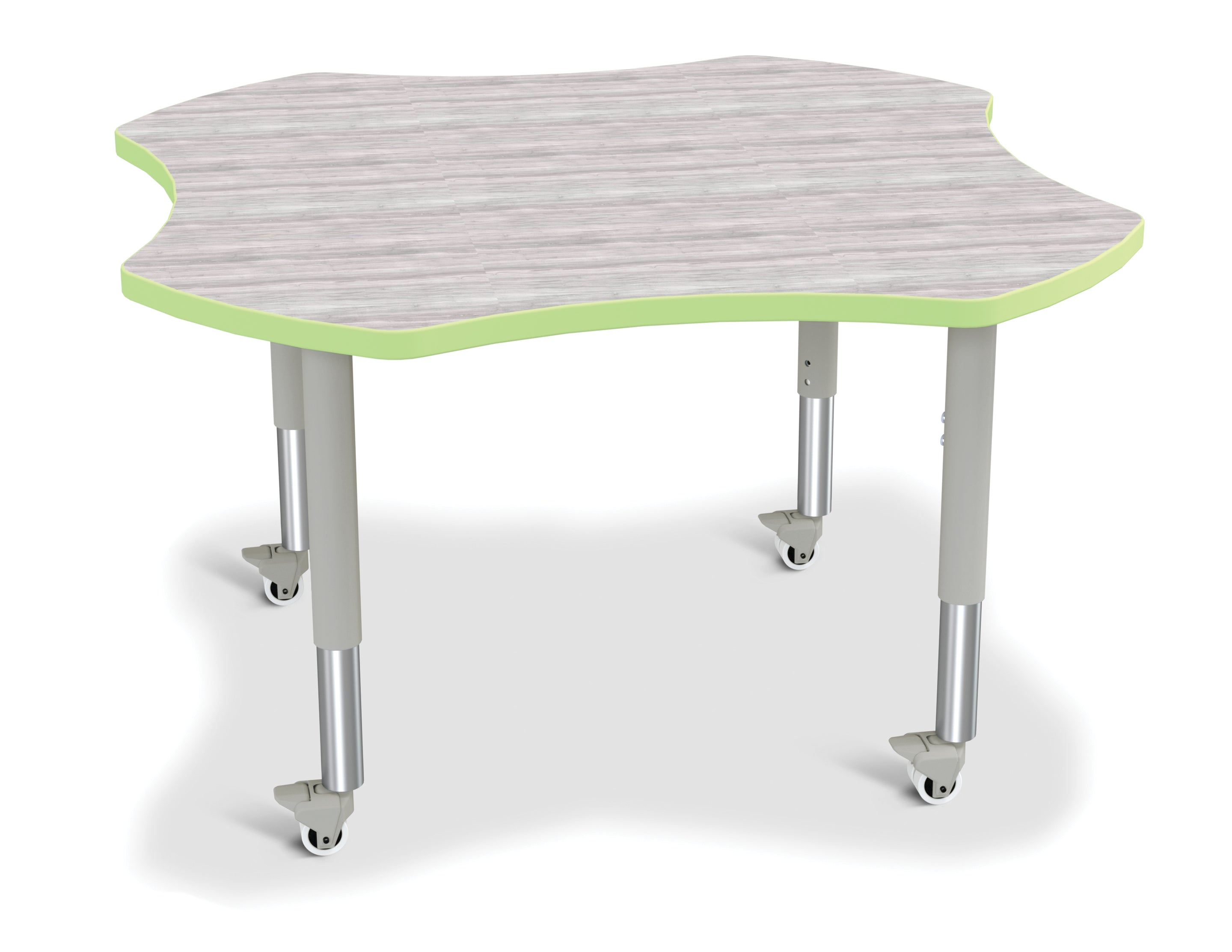 Seating in a fun shape! Accommodates up to 8 chairs. The legs adjust from 20â to 31â high, are 2â thick, and feature heavy-duty casters. Driftwood Gray tabletop with Key Lime TRUEdge, gray legs, and gray casters.KYDZSafe edges. KYDZStrong construction. TRUEdge. Choose from multiple tabletop and TRUEdge color combinations. Thermally Fused Laminate tabletops 1-1/8â thick. Quick mount legs with minimal assembly. Legs adjust in one-inch increments with the extra-safe dual-screw leg adjustability system. Helpful Hint: Most children require elementary size tables tiny tables typically fit children just 1 to 2 years old. Adjusts from 18â to 29â high (or 20â to 31â with casters). See cleaning recommendations at www.jonti-craft.com/cleaning.Product Height (inches):20-31Product Width (inches):42Product Depth (inches: 42