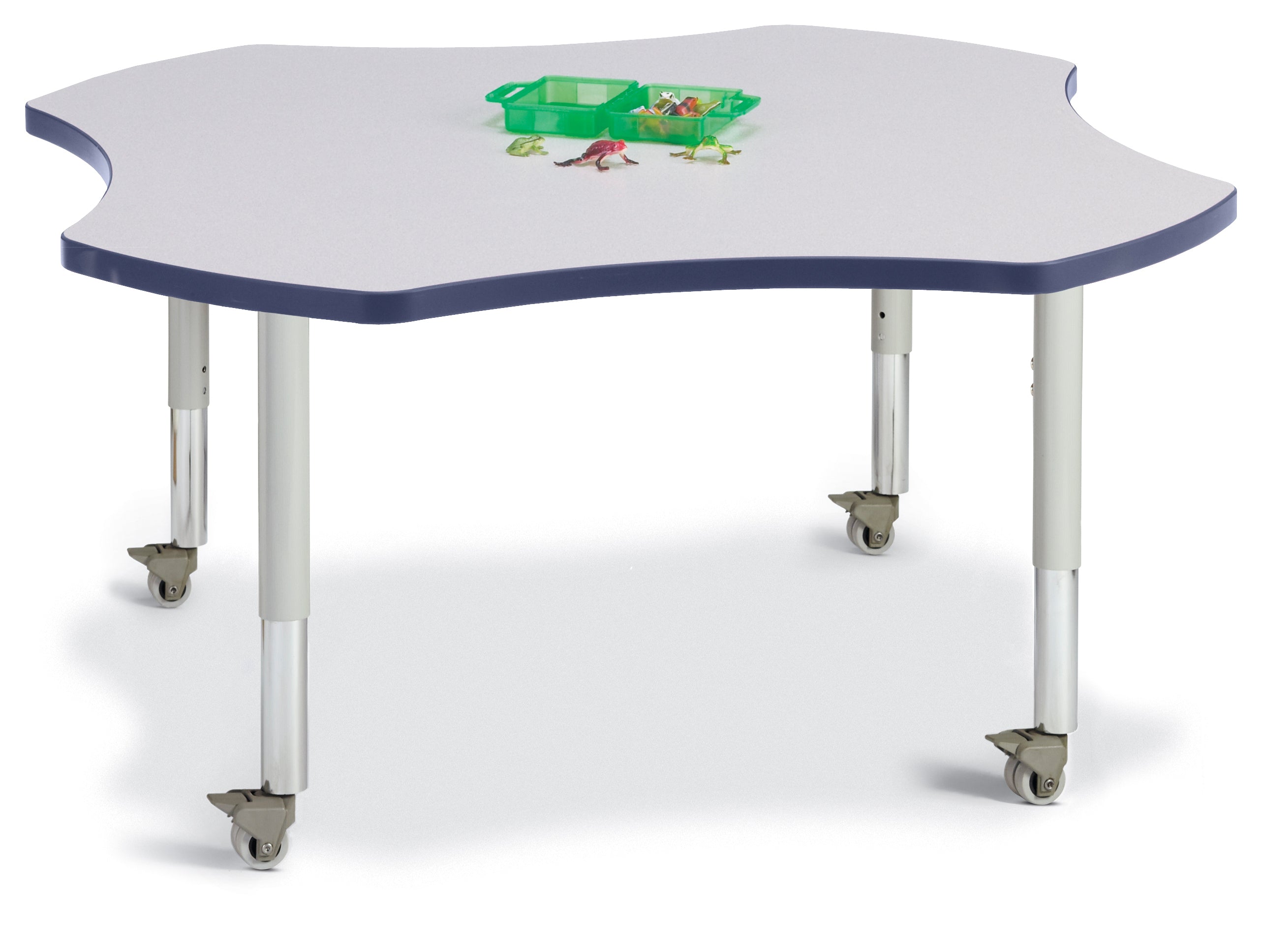 Seating in a fun shape! Accommodates up to 8 chairs. The legs adjust from 20â to 31â high, are 2â thick, and feature heavy-duty casters. Freckled gray laminate tabletop with navy TRUEdge, gray legs, and gray casters.KYDZSafe edges. KYDZStrong construction. TRUEdge. Choose from multiple tabletop and TRUEdge color combinations. Thermally Fused Laminate tabletops 1-1/8â thick. Quick mount legs with minimal assembly. Legs adjust in one-inch increments with the extra-safe dual-screw leg adjustability system. Helpful Hint: Most children require elementary size tables tiny tables typically fit children just 1 to 2 years old. See cleaning recommendations at www.jonti-craft.com/cleaning.Product Height (inches):20-31Product Width (inches):42Product Depth (inches: 42
