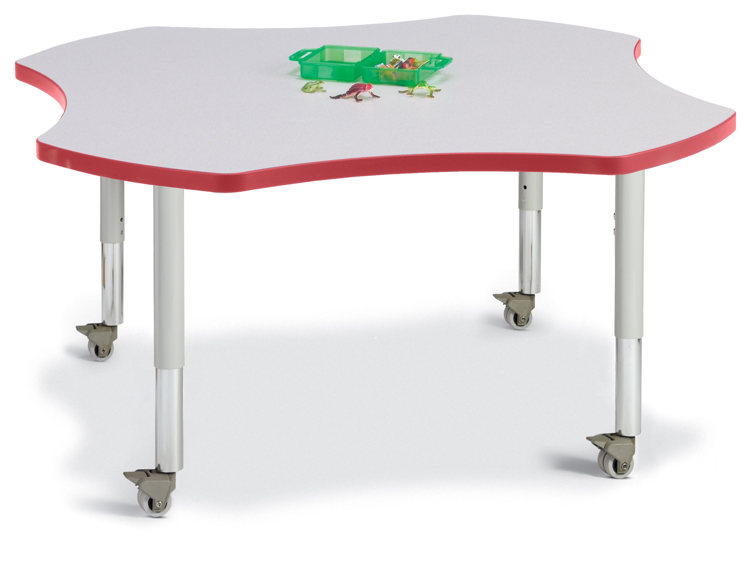 Seating in a fun shape! Accommodates up to 8 chairs. The legs adjust from 20â to 31â high, are 2â thick, and feature heavy-duty casters. Freckled gray laminate tabletop with red TRUEdge, gray legs, and gray casters.KYDZSafe edges. KYDZStrong construction. TRUEdge. Choose from multiple tabletop and TRUEdge color combinations. Thermally Fused Laminate tabletops 1-1/8â thick. Quick mount legs with minimal assembly. Legs adjust in one-inch increments with the extra-safe dual-screw leg adjustability system. Helpful Hint: Most children require elementary size tables tiny tables typically fit children just 1 to 2 years old. See cleaning recommendations at www.jonti-craft.com/cleaning.Product Height (inches):20-31Product Width (inches):42Product Depth (inches: 42