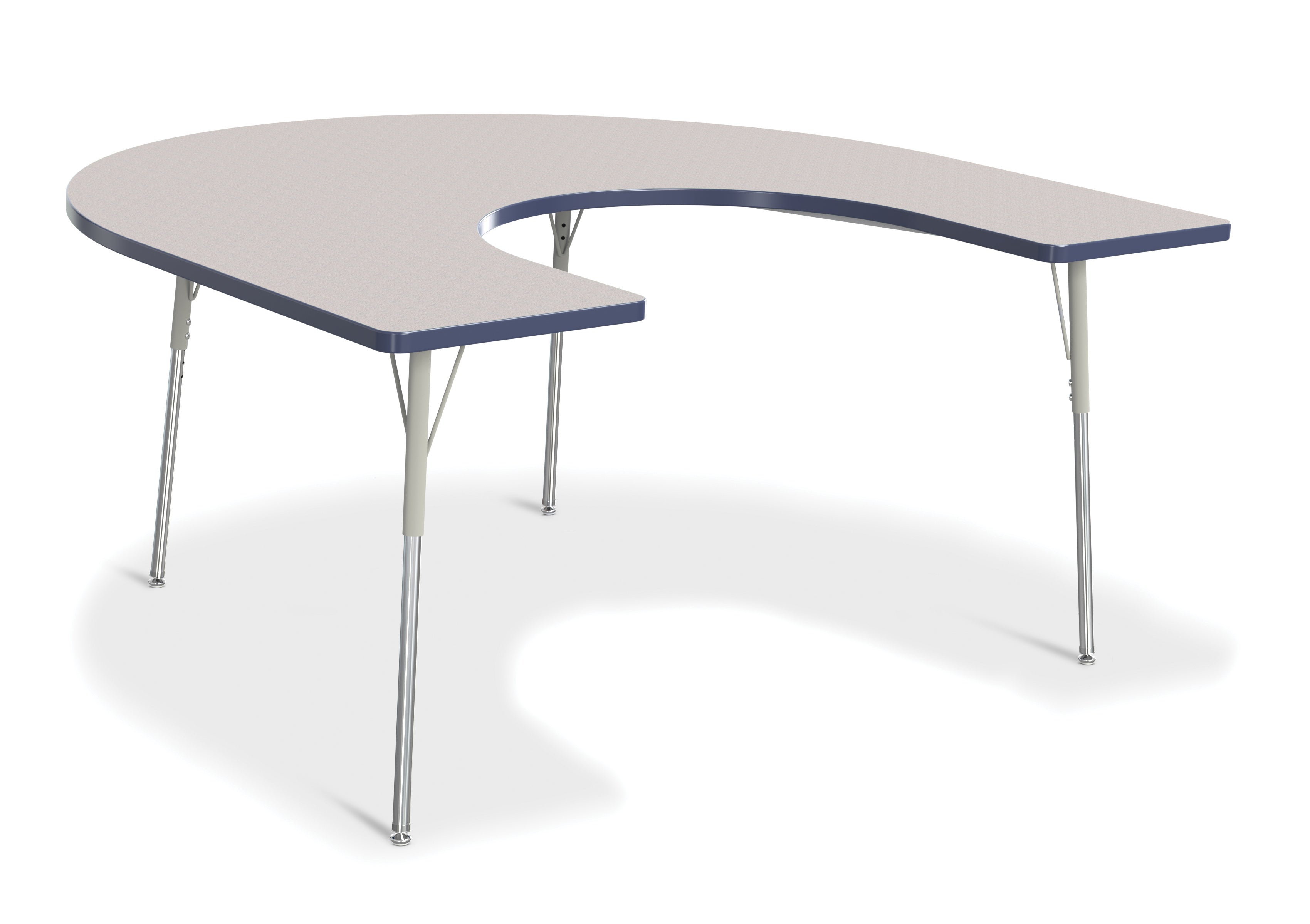Children can center around an educator easily with horseshoe tables. Accommodates up to 7 chairs. The legs feature glides that reduce noise, prevent snags, and don’t rust. Freckled gray laminate tabletop with navy TRUEdge and gray legs.KYDZSafe edges. KYDZStrong construction. TRUEdge. Choose from multiple tabletop and TRUEdge color combinations. Thermally Fused Laminate tabletops 1-1/8â thick. Standard legs available in Tiny, Elementary and Adult heights. Upper leg powder coated. Quick mount legs with minimal assembly. Legs adjust in one-inch increments with the extra-safe dual-screw leg adjustability system. Helpful Hint: Most children require elementary size tables tiny tables typically fit children just 1 to 2 years old. Adjusts from 24" to 31" high. See cleaning recommendations at www.jonti-craft.com/cleaning.Product Height (inches):24-31Product Width (inches):66Product Depth (inches: 60