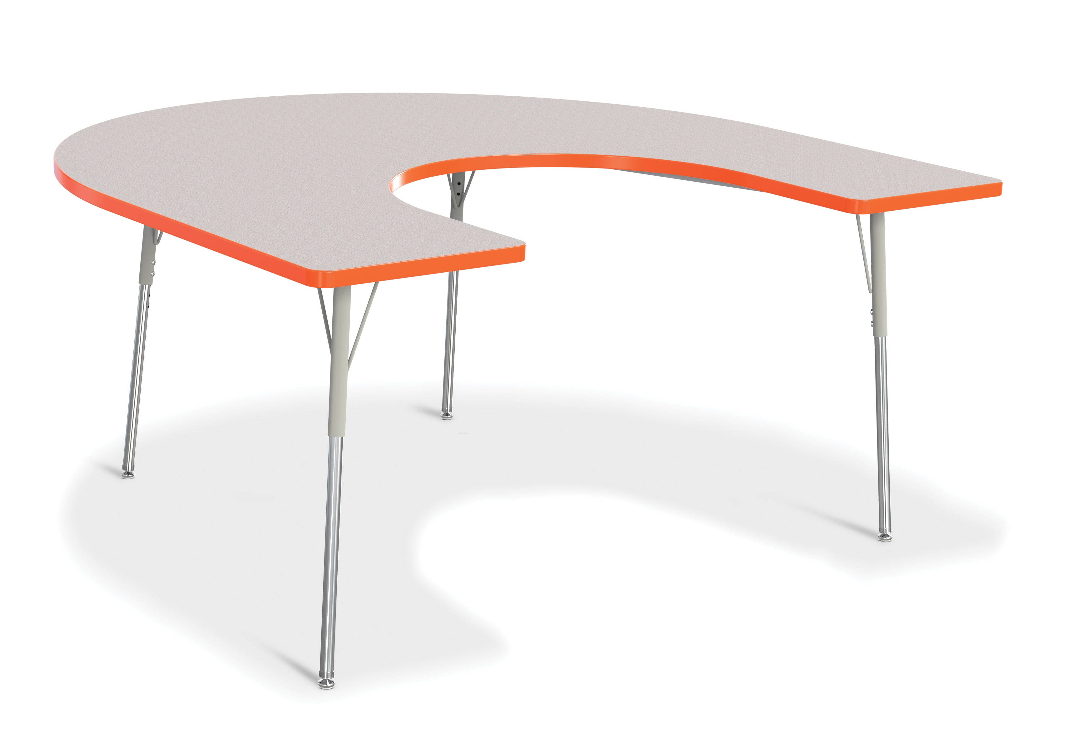 Children can center around an educator easily with horseshoe tables. Accommodates up to 7 chairs. The legs feature glides that reduce noise, prevent snags, and don’t rust. Freckled gray laminate tabletop with orange TRUEdge and gray legs.KYDZSafe edges. KYDZStrong construction. TRUEdge. Choose from multiple tabletop and TRUEdge color combinations. Thermally Fused Laminate tabletops 1-1/8â thick. Standard legs available in Tiny, Elementary and Adult heights. Upper leg powder coated. Quick mount legs with minimal assembly. Legs adjust in one-inch increments with the extra-safe dual-screw leg adjustability system. Helpful Hint: Most children require elementary size tables tiny tables typically fit children just 1 to 2 years old. Adjusts from 24" to 31" high. See cleaning recommendations at www.jonti-craft.com/cleaning.Product Height (inches):24-31Product Width (inches):66Product Depth (inches: 60
