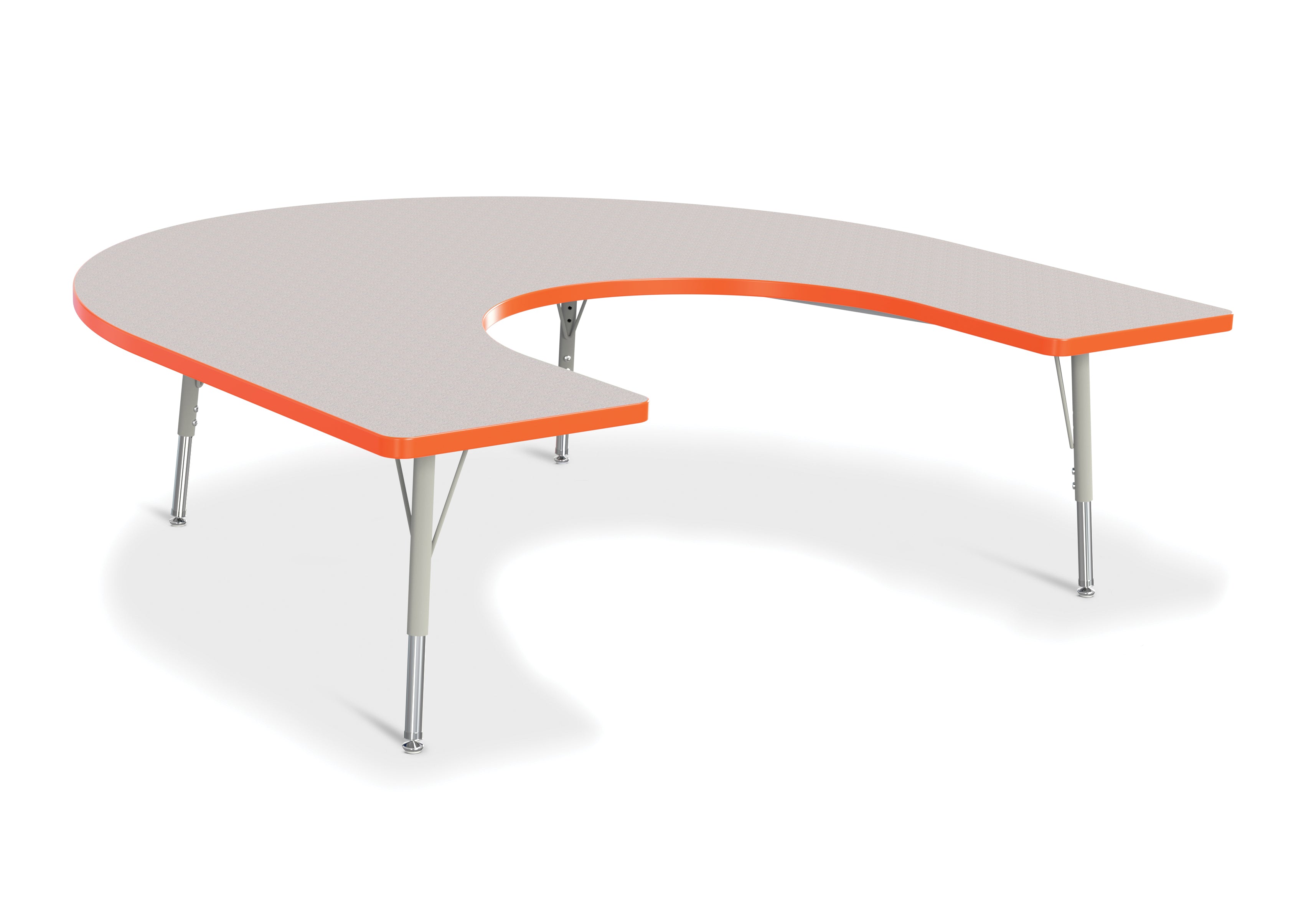 Children can center around an educator easily with horseshoe tables. Accommodates up to 9 chairs. The legs feature glides that reduce noise, prevent snags, and don’t rust. Freckled gray laminate tabletop with orange TRUEdge and gray legs.KYDZSafe edges. KYDZStrong construction. TRUEdge. Choose from multiple tabletop and TRUEdge color combinations. Thermally Fused Laminate tabletops 1-1/8â thick. Standard legs available in Tiny, Elementary and Adult heights. Upper leg powder coated. Quick mount legs with minimal assembly. Legs adjust in one-inch increments with the extra-safe dual-screw leg adjustability system. Helpful Hint: Most children require elementary size tables tiny tables typically fit children just 1 to 2 years old. Adjusts from 15" to 24" high. See cleaning recommendations at www.jonti-craft.com/cleaning.Product Height (inches):15-24Product Width (inches):66Product Depth (inches: 60