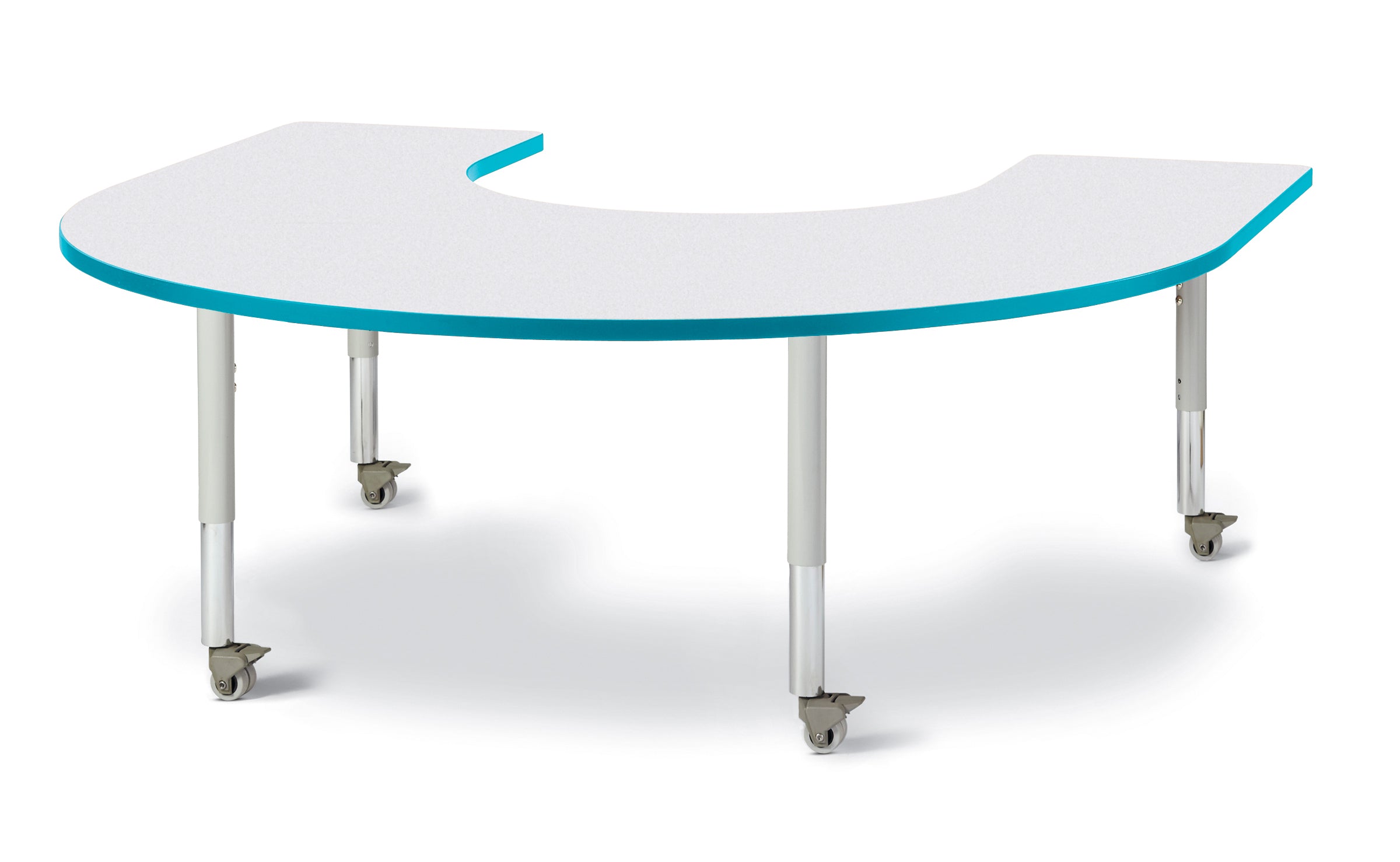 Children can center around an educator easily with horseshoe tables. Accommodates up to 9 chairs. The legs adjust from 20â to 31â high, are 2â thick, and feature heavy-duty casters. Freckled gray laminate tabletop with teal TRUEdge, gray legs, and gray casters.KYDZSafe edges. KYDZStrong construction. TRUEdge. Choose from multiple tabletop and TRUEdge color combinations. Thermally Fused Laminate tabletops 1-1/8â thick. Quick mount legs with minimal assembly. Legs adjust in one-inch increments with the extra-safe dual-screw leg adjustability system. Helpful Hint: Most children require elementary size tables tiny tables typically fit children just 1 to 2 years old. See cleaning recommendations at www.jonti-craft.com/cleaning.Product Height (inches):20-31Product Width (inches):66Product Depth (inches: 60