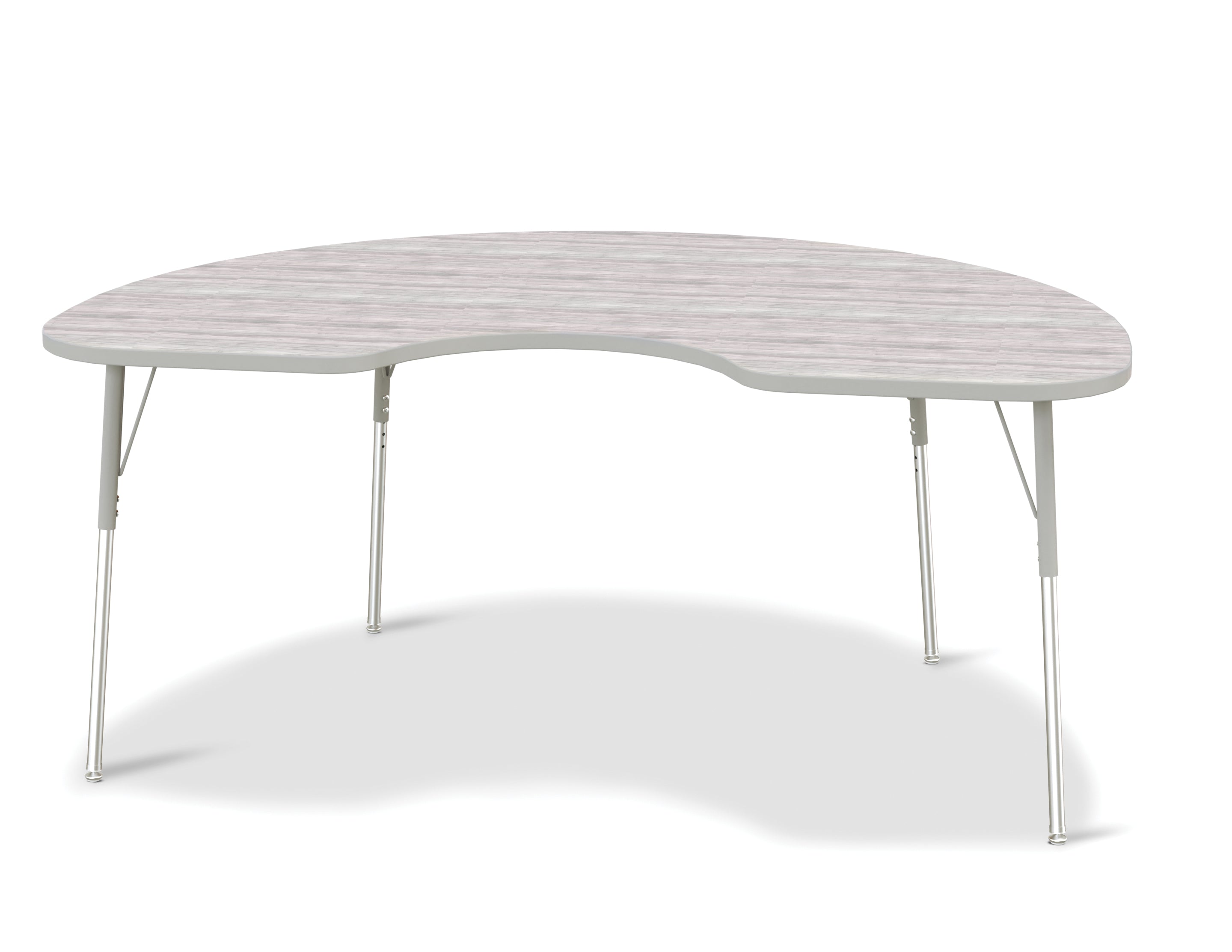 Educators can easily interact with individual children without disturbing others with Kidney Tables. Accommodates up to 5 chairs. The legs feature glides that reduce noise, prevent snags, and resist rust. Driftwood Gray laminate tabletop with Gray TRUEdge and Gray legs.KYDZSafe edges. KYDZStrong construction. TRUEdge. Choose from multiple tabletop and TRUEdge color combinations. Thermally Fused Laminate tabletops 1-1/8â thick. Quick mount legs with minimal assembly. Legs adjust in one-inch increments with the extra-safe dual-screw leg adjustability system. Helpful Hint: Most children require elementary size tables tiny tables typically fit children just 1 to 2 years old. Adjusts from 24" to 31" high. See cleaning recommendations at www.jonti-craft.com/cleaning.Product Height (inches):24-31Product Width (inches):72Product Depth (inches: 48