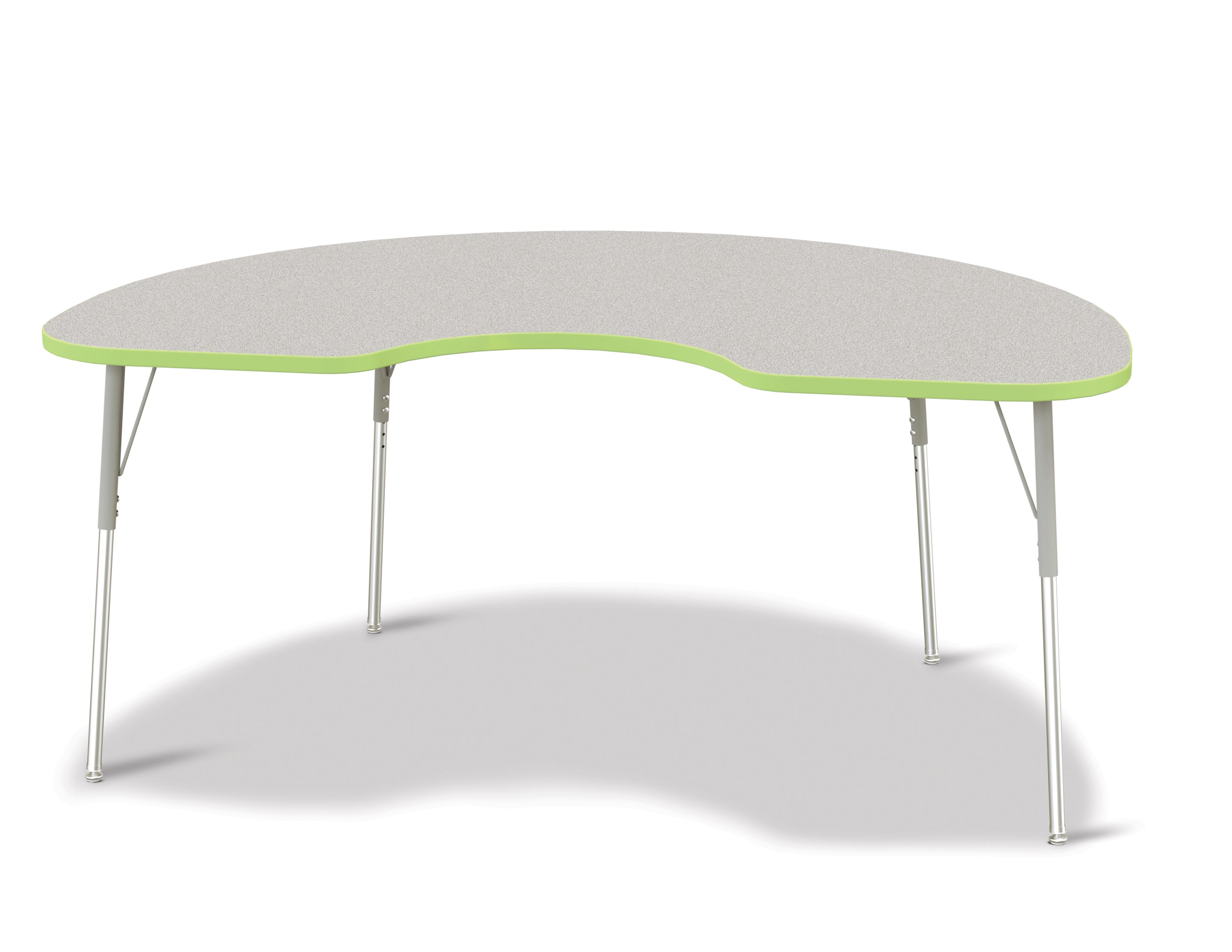 Educators can easily interact with individual children without disturbing others with Kidney Tables. Accommodates up to 5 chairs. The legs feature glides that reduce noise, prevent snags, and resist rust. Freckled gray laminate tabletop with green TRUEdge and gray legs.KYDZSafe edges. KYDZStrong construction. TRUEdge. Choose from multiple tabletop and TRUEdge color combinations. Thermally Fused Laminate tabletops 1-1/8â thick. Quick mount legs with minimal assembly. Legs adjust in one-inch increments with the extra-safe dual-screw leg adjustability system. Helpful Hint: Most children require elementary size tables tiny tables typically fit children just 1 to 2 years old. Adjusts from 24" to 31" high. See cleaning recommendations at www.jonti-craft.com/cleaning.Product Height (inches):24-31Product Width (inches):72Product Depth (inches: 48