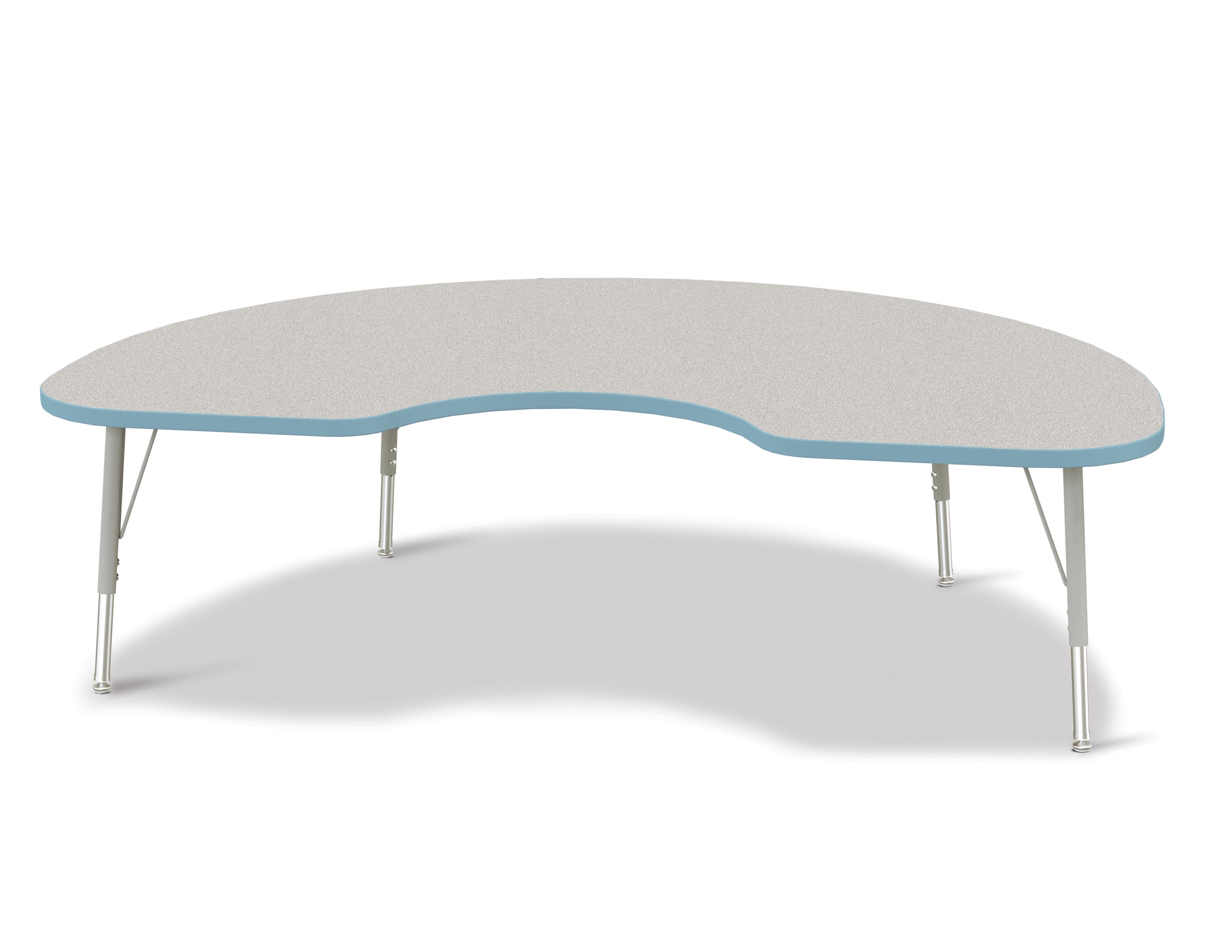 Educators can easily interact with individual children without disturbing others with Kidney Tables. Accommodates up to 8 chairs. The legs feature glides that reduce noise, prevent snags, and resist rust. Freckled gray laminate tabletop with green TRUEdge and gray legs.KYDZSafe edges. KYDZStrong construction. TRUEdge. Choose from multiple tabletop and TRUEdge color combinations. Thermally Fused Laminate tabletops 1-1/8â thick. Quick mount legs with minimal assembly. Legs adjust in one-inch increments with the extra-safe dual-screw leg adjustability system. Helpful Hint: Most children require elementary size tables tiny tables typically fit children just 1 to 2 years old. Adjusts from 15" to 24" high. See cleaning recommendations at www.jonti-craft.com/cleaning.Product Height (inches):15-24Product Width (inches):72Product Depth (inches: 48