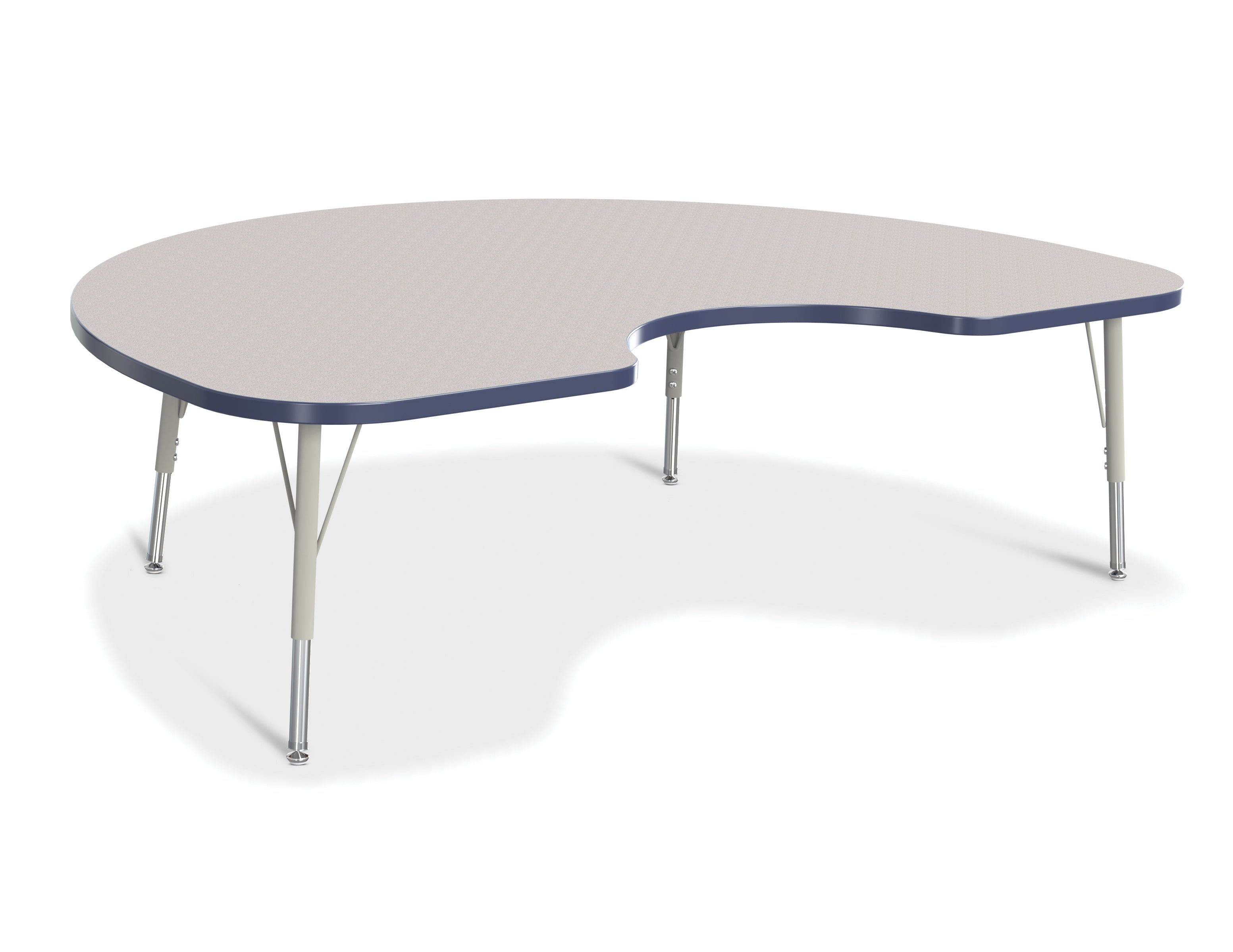 Educators can easily interact with individual children without disturbing others with Kidney Tables. Accommodates up to 8 chairs. The legs feature glides that reduce noise, prevent snags, and resist rust. Freckled gray laminate tabletop with navy TRUEdge and gray legs.KYDZSafe edges. KYDZStrong construction. TRUEdge. Choose from multiple tabletop and TRUEdge color combinations. Thermally Fused Laminate tabletops 1-1/8â thick. Quick mount legs with minimal assembly. Legs adjust in one-inch increments with the extra-safe dual-screw leg adjustability system. Helpful Hint: Most children require elementary size tables tiny tables typically fit children just 1 to 2 years old. Adjusts from 15" to 24" high. See cleaning recommendations at www.jonti-craft.com/cleaning.Product Height (inches):15-24Product Width (inches):72Product Depth (inches: 48