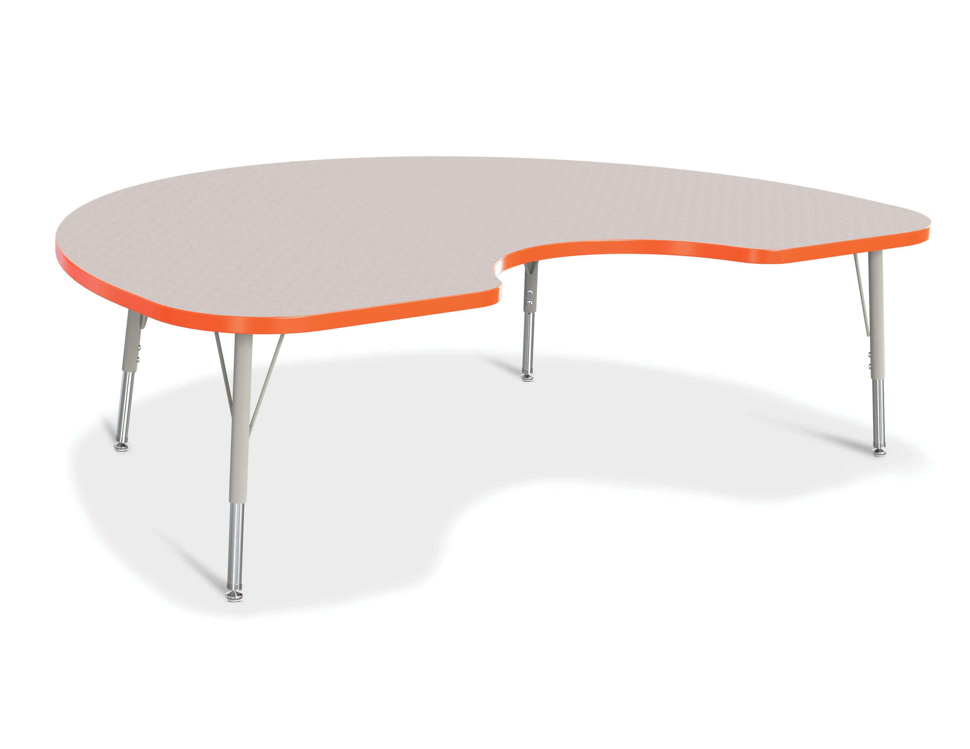 Educators can easily interact with individual children without disturbing others with Kidney Tables. Accommodates up to 8 chairs. The legs feature glides that reduce noise, prevent snags, and resist rust. Freckled gray laminate tabletop with orange TRUEdge and gray legs.KYDZSafe edges. KYDZStrong construction. TRUEdge. Choose from multiple tabletop and TRUEdge color combinations. Thermally Fused Laminate tabletops 1-1/8â thick. Quick mount legs with minimal assembly. Legs adjust in one-inch increments with the extra-safe dual-screw leg adjustability system. Helpful Hint: Most children require elementary size tables tiny tables typically fit children just 1 to 2 years old. Adjusts from 15" to 24" high. See cleaning recommendations at www.jonti-craft.com/cleaning.Product Height (inches):15-24Product Width (inches):72Product Depth (inches: 48