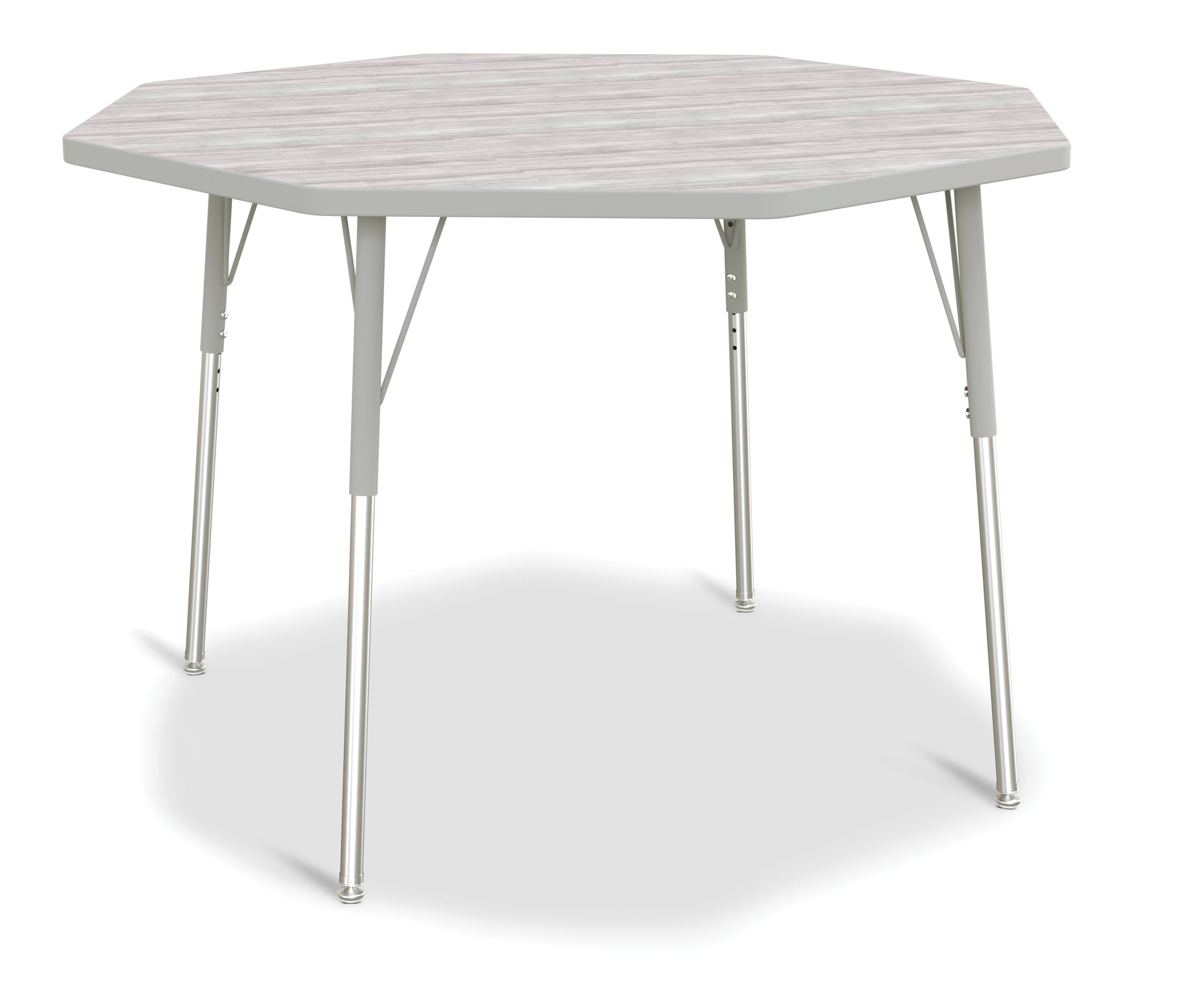 Kids will enjoy learning together while having their own space with the octagon table. Accommodates up to 4 chairs. The legs feature glides that reduce noise, prevent snags, and resist rust. Driftwood Gray tabletop with Gray TRUEdge and Gray legs.KYDZSafe edges. KYDZStrong construction. TRUEdge. Choose from multiple tabletop and TRUEdge color combinations. Thermally Fused Laminate tabletops 1-1/8â thick. Quick mount legs with minimal assembly. Legs adjust in one-inch increments with the extra-safe dual-screw leg adjustability system. Helpful Hint: Most children require elementary size tables tiny tables typically fit children just 1 to 2 years old. Adjusts from 24" to 31" high. See cleaning recommendations at www.jonti-craft.com/cleaning.Product Height (inches):24-31Product Width (inches):48Product Depth (inches: 48