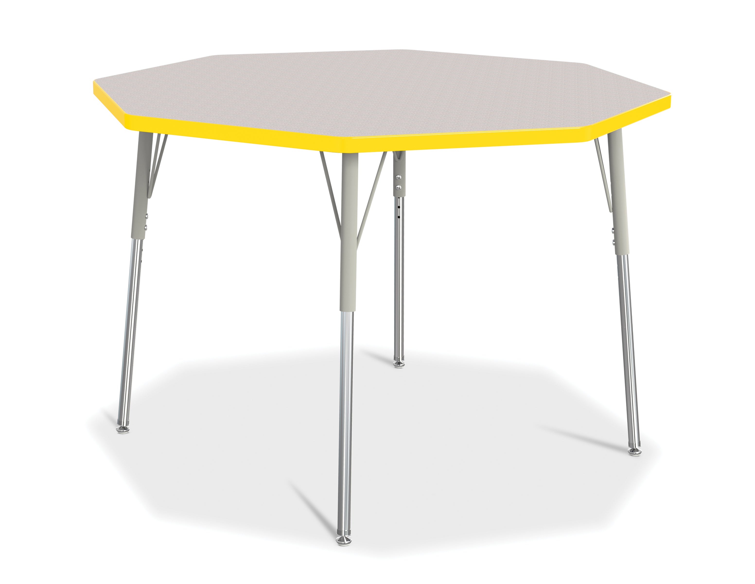 Kids will enjoy learning together while having their own space with the octagon table. Accommodates up to 4 chairs. The legs feature glides that reduce noise, prevent snags, and resist rust. Freckled gray laminate tabletop with yellow TRUEdge and gray legs.KYDZSafe edges. KYDZStrong construction. TRUEdge. Choose from multiple tabletop and TRUEdge color combinations. Thermally Fused Laminate tabletops 1-1/8â thick. Quick mount legs with minimal assembly. Legs adjust in one-inch increments with the extra-safe dual-screw leg adjustability system. Helpful Hint: Most children require elementary size tables tiny tables typically fit children just 1 to 2 years old. Adjusts from 24" to 31" high. See cleaning recommendations at www.jonti-craft.com/cleaning.Product Height (inches):24-31Product Width (inches):48Product Depth (inches: 48