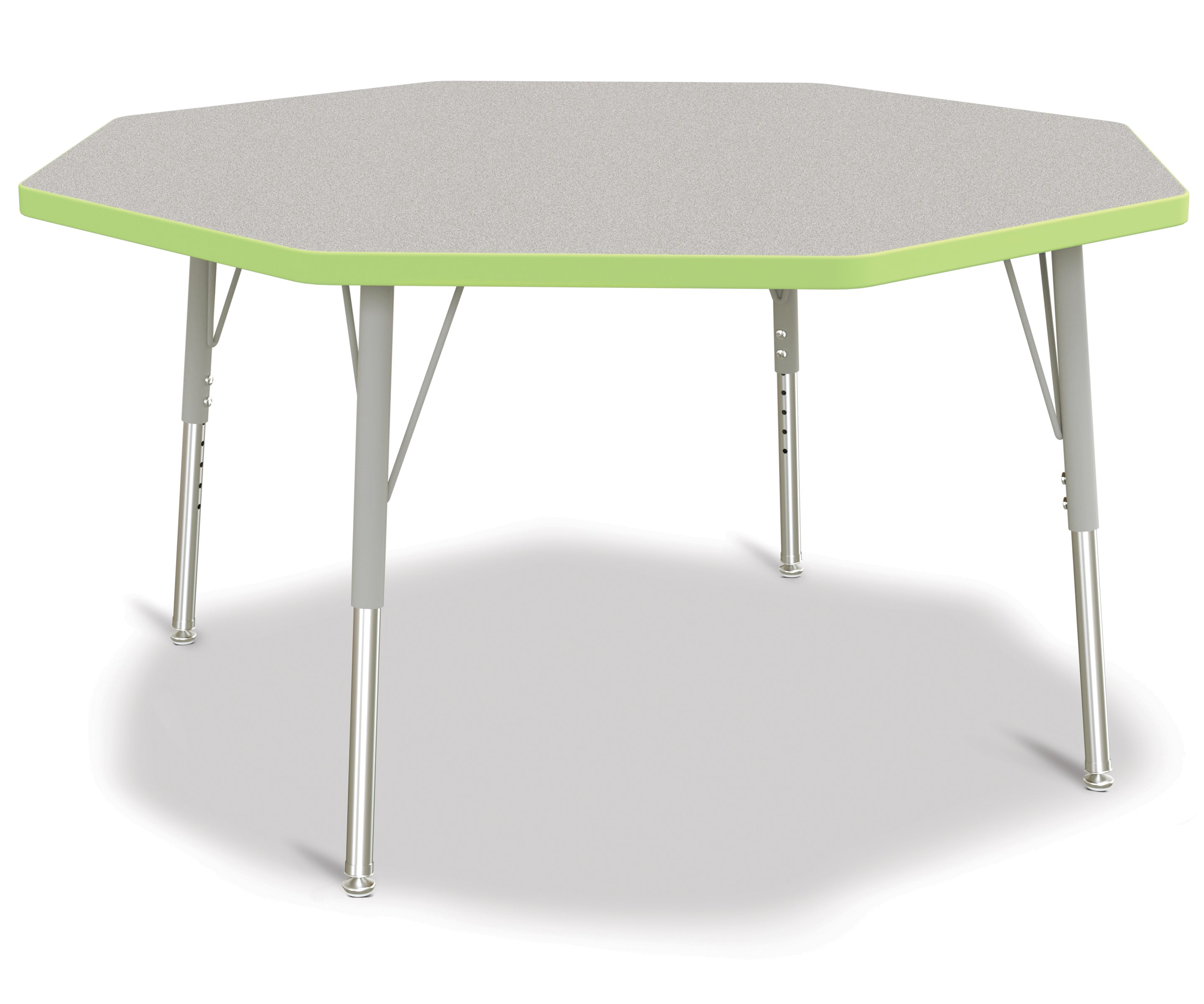 Kids will enjoy learning together while having their own space with the octagon table. Accommodates up to 8 chairs. The legs feature glides that reduce noise, prevent snags, and resist rust. Freckled gray laminate tabletop with green TRUEdge and gray legs.KYDZSafe edges. KYDZStrong construction. TRUEdge. Choose from multiple tabletop and TRUEdge color combinations. Thermally Fused Laminate tabletops 1-1/8â thick. Quick mount legs with minimal assembly. Legs adjust in one-inch increments with the extra-safe dual-screw leg adjustability system. Helpful Hint: Most children require elementary size tables tiny tables typically fit children just 1 to 2 years old. Adjusts from 15" to 24" high. See cleaning recommendations at www.jonti-craft.com/cleaning.Product Height (inches):15-24Product Width (inches):48Product Depth (inches: 48