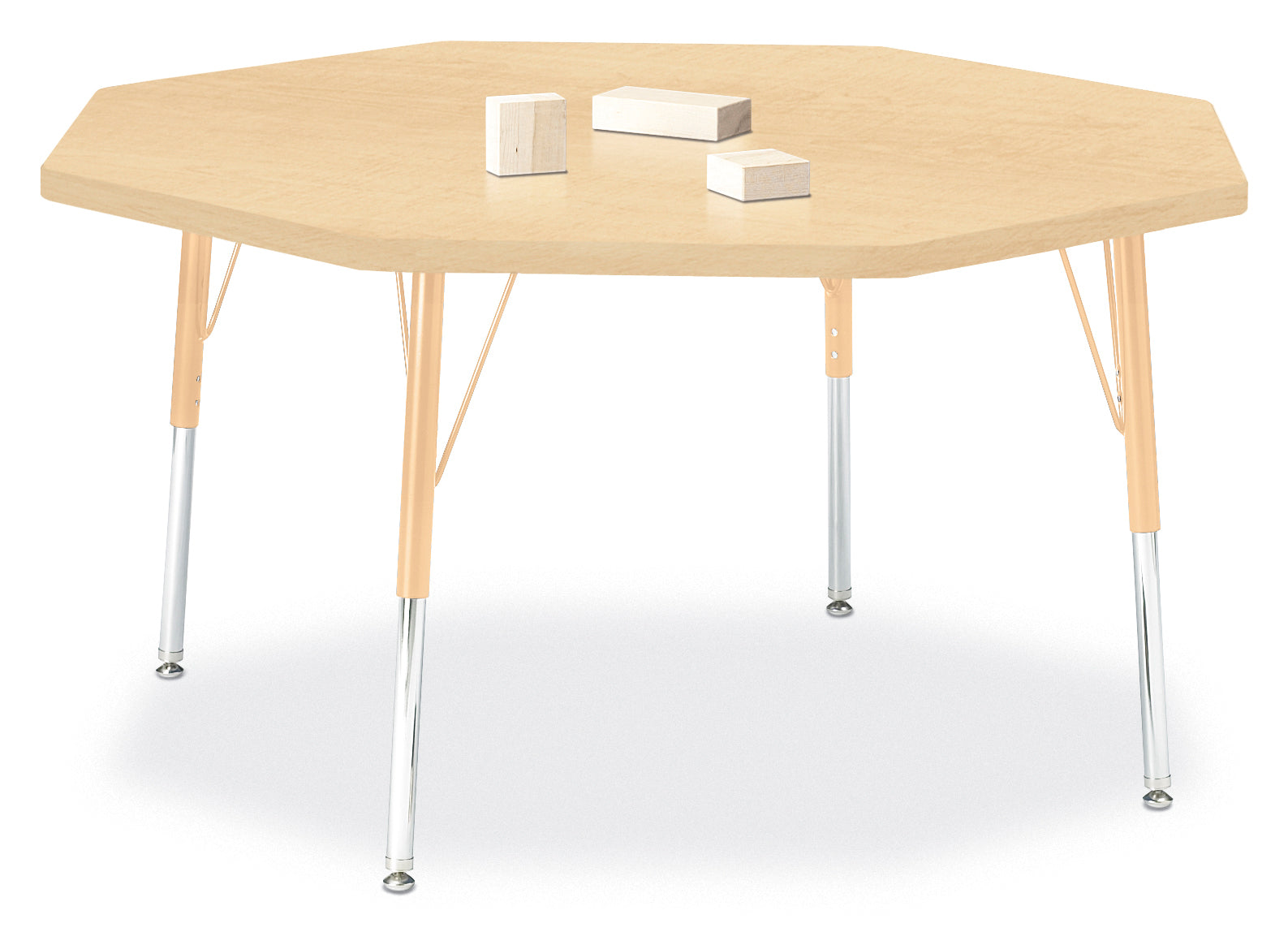 Kids will enjoy learning together while having their own space with the octagon table. Accommodates up to 8 chairs. The legs feature glides that reduce noise, prevent snags, and resist rust. Maple tabletop with maple TRUEdge and camel legs.KYDZSafe edges. KYDZStrong construction. TRUEdge. Choose from multiple tabletop and TRUEdge color combinations. Thermally Fused Laminate tabletops 1-1/8â thick. Quick mount legs with minimal assembly. Legs adjust in one-inch increments with the extra-safe dual-screw leg adjustability system. Helpful Hint: Most children require elementary size tables tiny tables typically fit children just 1 to 2 years old. Adjusts from 15" to 24" high. See cleaning recommendations at www.jonti-craft.com/cleaning.Product Height (inches):15-24Product Width (inches):48Product Depth (inches: 48