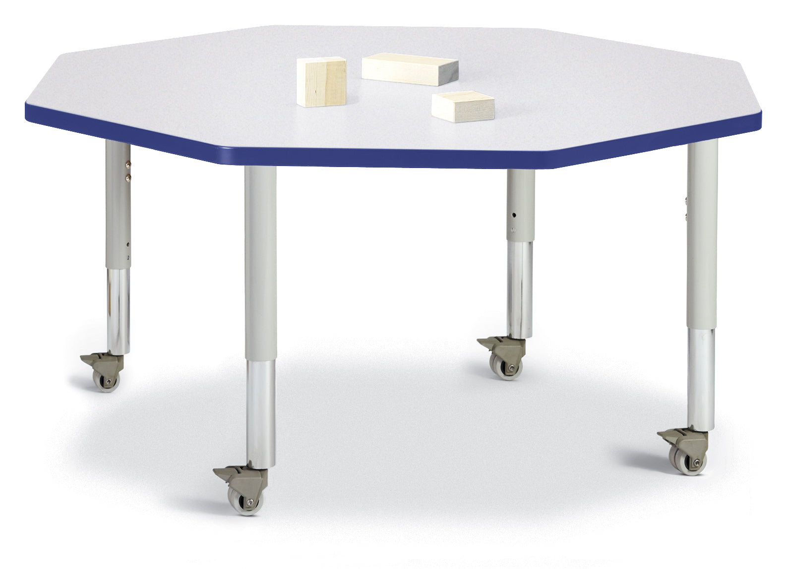Kids will enjoy learning together while having their own space with the Octagon Table. Accommodates up to 8 chairs. The legs adjust from 20â to 31â high, are 2â thick, and feature heavy-duty casters. Freckled gray laminate tabletop with blue TRUEdge, gray legs, and gray casters.KYDZSafe edges. KYDZStrong construction. TRUEdge. Choose from multiple tabletop and TRUEdge color combinations. Thermally Fused Laminate tabletops 1-1/8â thick. Quick mount legs with minimal assembly. Legs adjust in one-inch increments with the extra-safe dual-screw leg adjustability system. Helpful Hint: Most children require elementary size tables tiny tables typically fit children just 1 to 2 years old. See cleaning recommendations at www.jonti-craft.com/cleaning.Product Height (inches):20-31Product Width (inches):48Product Depth (inches: 48