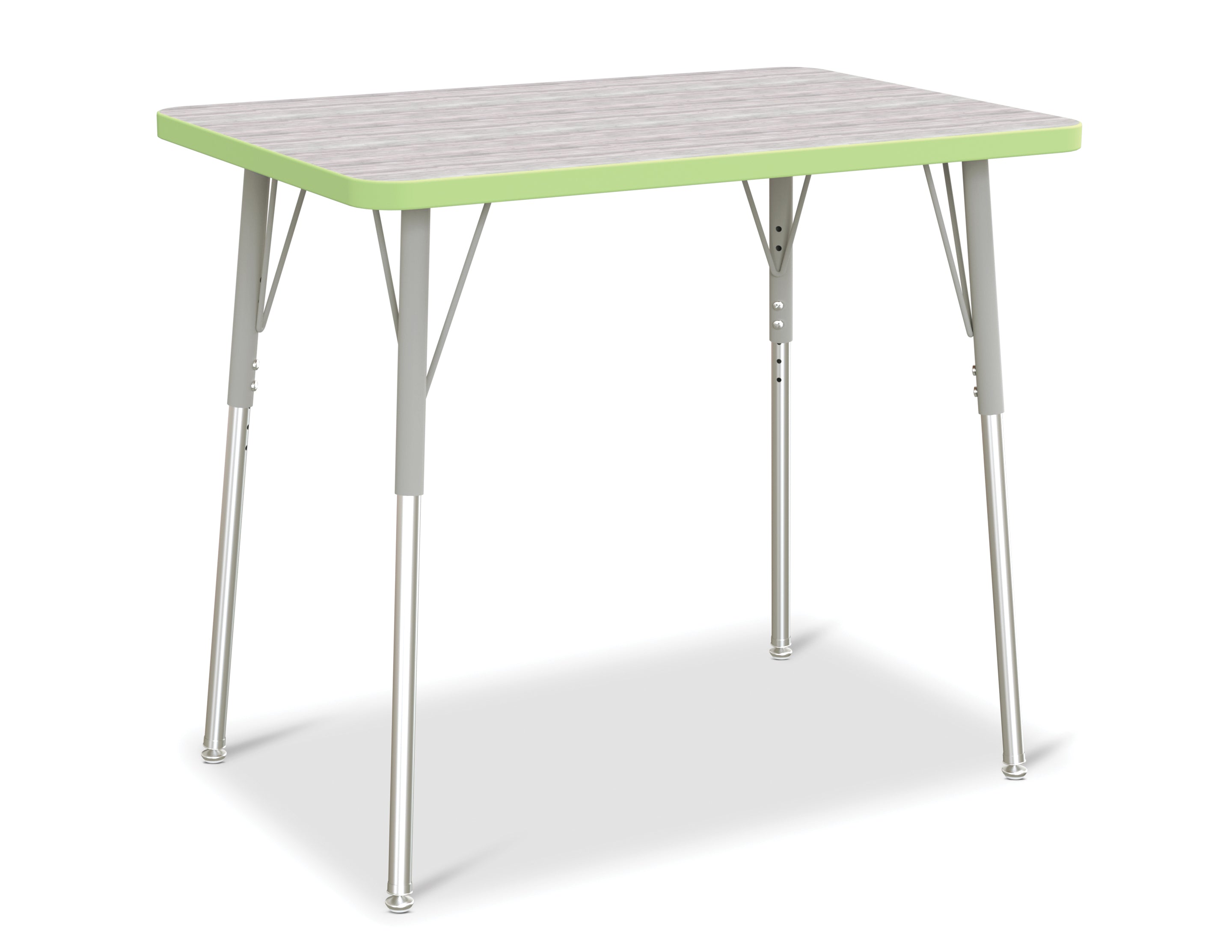 The perfect table for any occasion. Accommodates up to 2 chairs. The legs feature glides that reduce noise, prevent snags, and resist rust. Driftwood Gray tabletop with Key Lime TRUEdge and Gray legs.KYDZSafe edges. KYDZStrong construction. TRUEdge. Choose from multiple tabletop and TRUEdge color combinations. Thermally Fused Laminate tabletops 1-1/8â thick. Quick mount legs with minimal assembly. Legs adjust in one-inch increments with the extra-safe dual-screw leg adjustability system. Helpful Hint: Most children require elementary size tables tiny tables typically fit children just 1 to 2 years old. Adjusts from 24" to 31" high. See cleaning recommendations at www.jonti-craft.com/cleaning.Product Height (inches):24-31Product Width (inches):36Product Depth (inches: 24