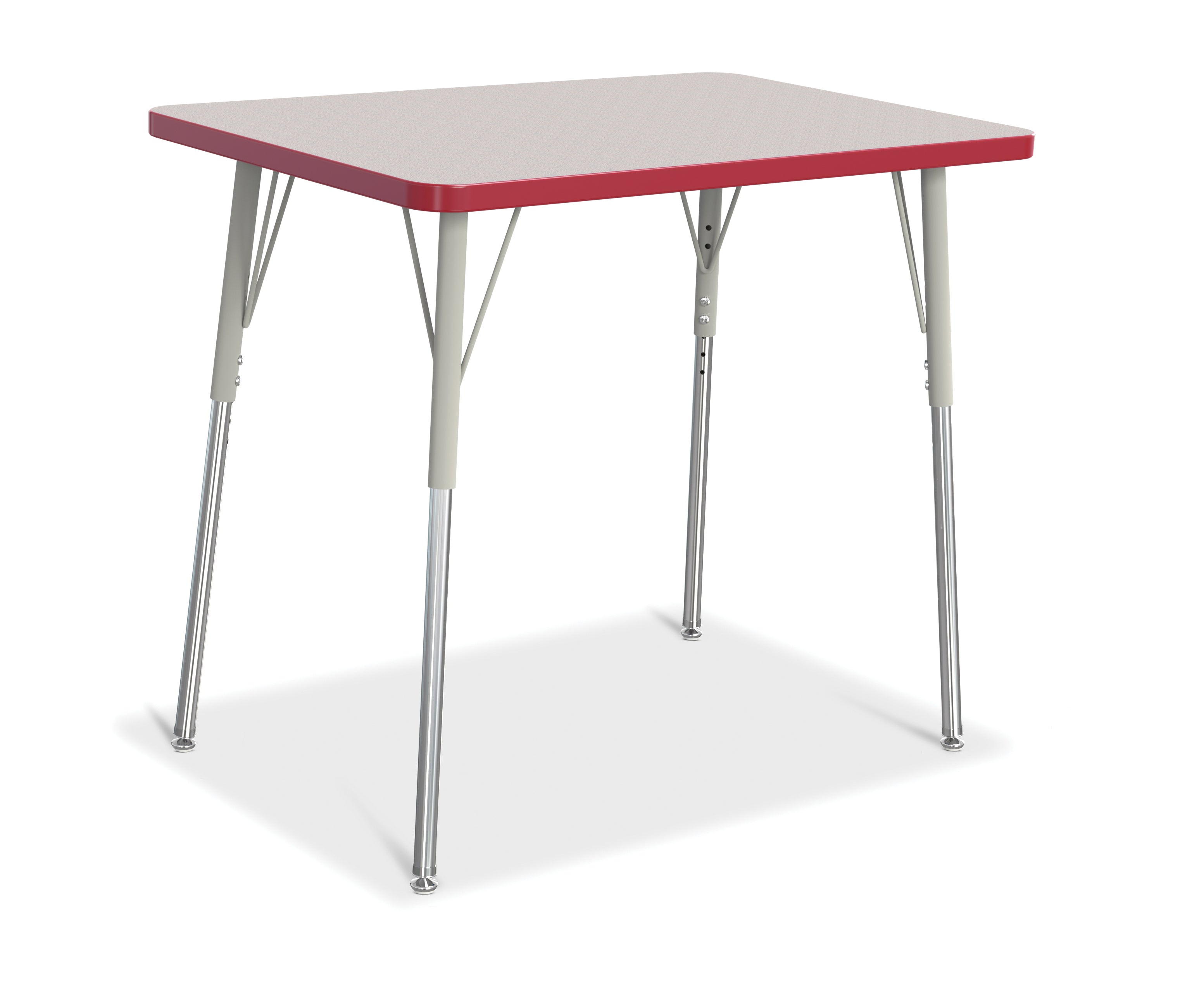 The perfect table for any occasion. Accommodates up to 2 chairs. The legs feature glides that reduce noise, prevent snags, and resist rust. Freckled gray laminate tabletop with red TRUEdge and gray legs.KYDZSafe edges. KYDZStrong construction. TRUEdge. Choose from multiple tabletop and TRUEdge color combinations. Thermally Fused Laminate tabletops 1-1/8â thick. Quick mount legs with minimal assembly. Legs adjust in one-inch increments with the extra-safe dual-screw leg adjustability system. Helpful Hint: Most children require elementary size tables tiny tables typically fit children just 1 to 2 years old. Adjusts from 24" to 31" high. See cleaning recommendations at www.jonti-craft.com/cleaning.Product Height (inches):24-31Product Width (inches):36Product Depth (inches: 24