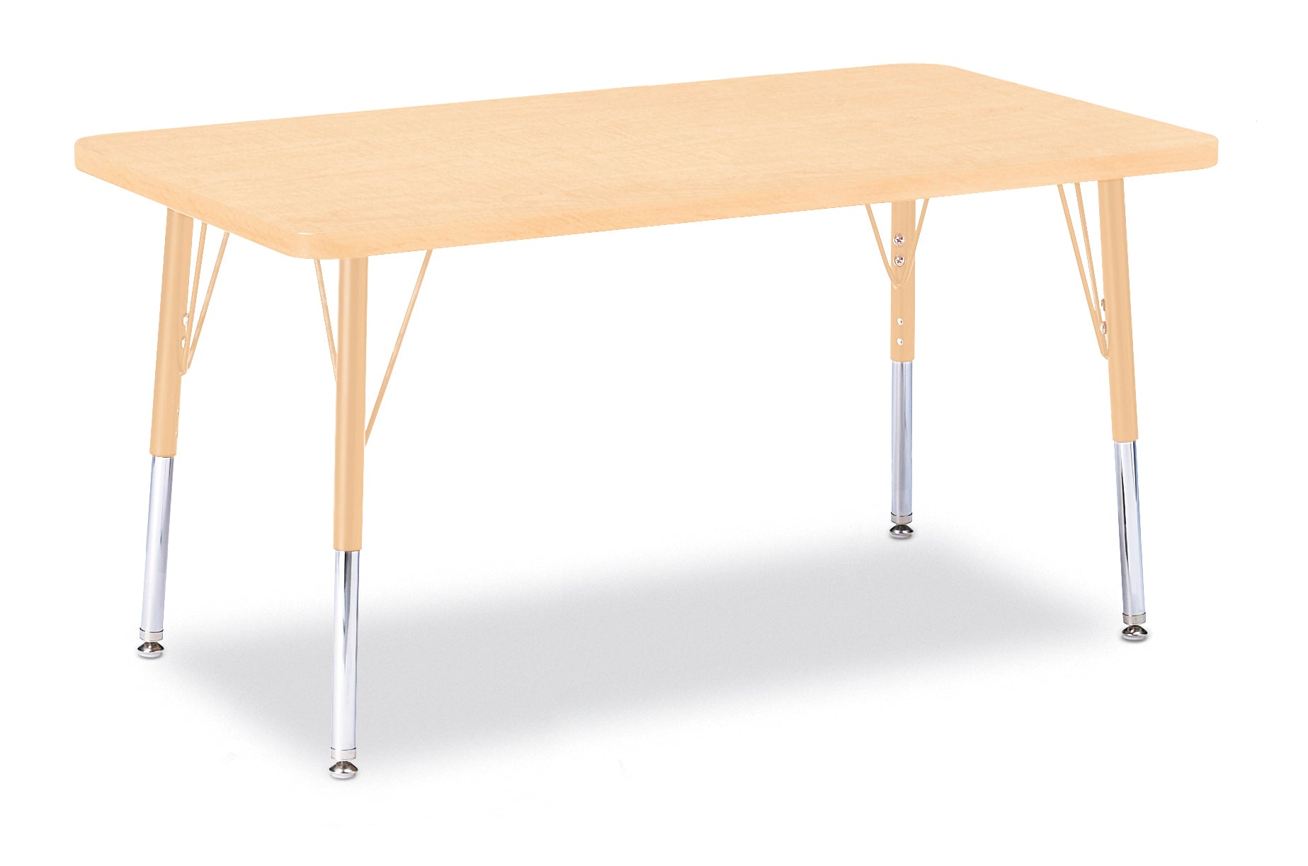 The perfect table for any occasion. Accommodates up to 4 chairs. The legs feature glides that reduce noise, prevent snags, and resist rust. Maple tabletop with maple TRUEdge and camel legs.KYDZSafe edges. KYDZStrong construction. TRUEdge. Choose from multiple tabletop and TRUEdge color combinations. Thermally Fused Laminate tabletops 1-1/8â thick. Quick mount legs with minimal assembly. Legs adjust in one-inch increments with the extra-safe dual-screw leg adjustability system. Helpful Hint: Most children require elementary size tables tiny tables typically fit children just 1 to 2 years old. Adjusts from 15" to 24" high. See cleaning recommendations at www.jonti-craft.com/cleaning.Product Height (inches):15-24Product Width (inches):36Product Depth (inches: 24