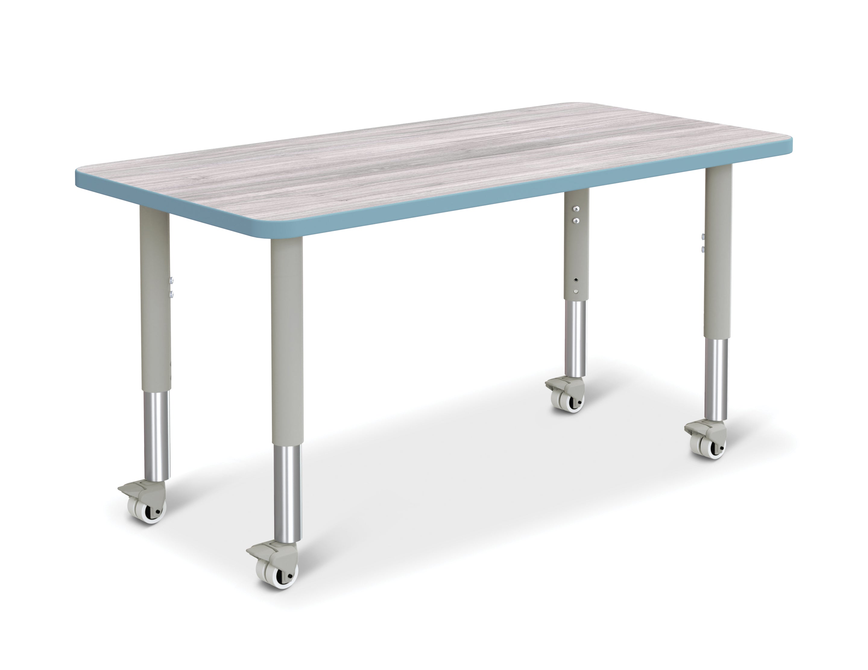 The perfect table for any occasion. Accommodates up to 6 chairs. The legs adjust from 20â to 31â high, are 2â thick, and feature heavy-duty casters. Driftwood Gray tabletop with Coastal Blue TRUEdge, gray legs, and gray casters.KYDZSafe edges. KYDZStrong construction. TRUEdge. Choose from multiple tabletop and TRUEdge color combinations. Thermally Fused Laminate tabletops 1-1/8â thick. Quick mount legs with minimal assembly. Legs adjust in one-inch increments with the extra-safe dual-screw leg adjustability system. Helpful Hint: Most children require elementary size tables tiny tables typically fit children just 1 to 2 years old. Adjusts from 18â to 29â high (or 20â to 31â with casters). See cleaning recommendations at www.jonti-craft.com/cleaning.Product Height (inches):20-31Product Width (inches):48Product Depth (inches: 24