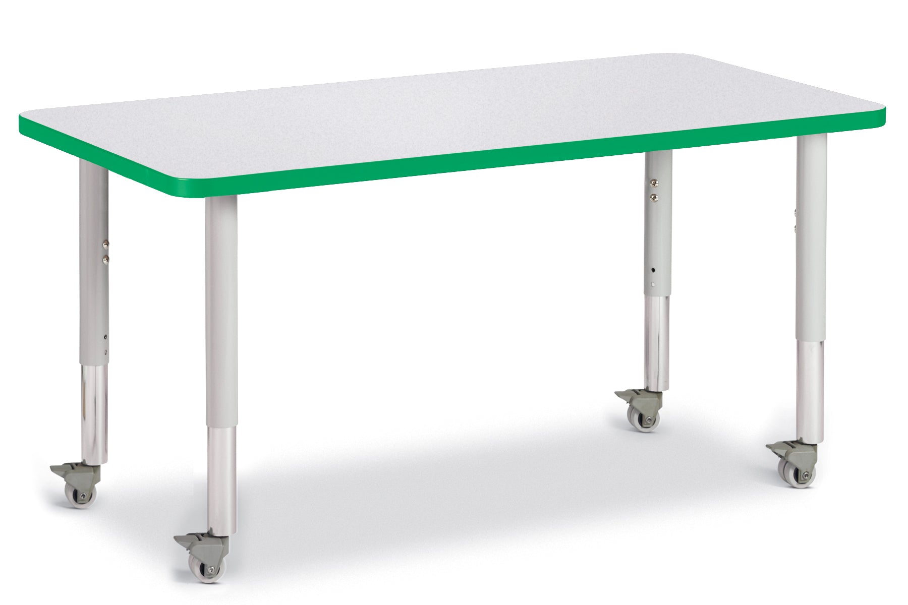 The perfect table for any occasion. Accommodates up to 6 chairs. The legs adjust from 20â to 31â high, are 2â thick, and feature heavy-duty casters. Freckled gray laminate tabletop with green TRUEdge, gray legs, and gray casters.KYDZSafe edges. KYDZStrong construction. TRUEdge. Choose from multiple tabletop and TRUEdge color combinations. Thermally Fused Laminate tabletops 1-1/8â thick. Quick mount legs with minimal assembly. Legs adjust in one-inch increments with the extra-safe dual-screw leg adjustability system. Helpful Hint: Most children require elementary size tables tiny tables typically fit children just 1 to 2 years old. See cleaning recommendations at www.jonti-craft.com/cleaning.Product Height (inches):20-31Product Width (inches):48Product Depth (inches: 24