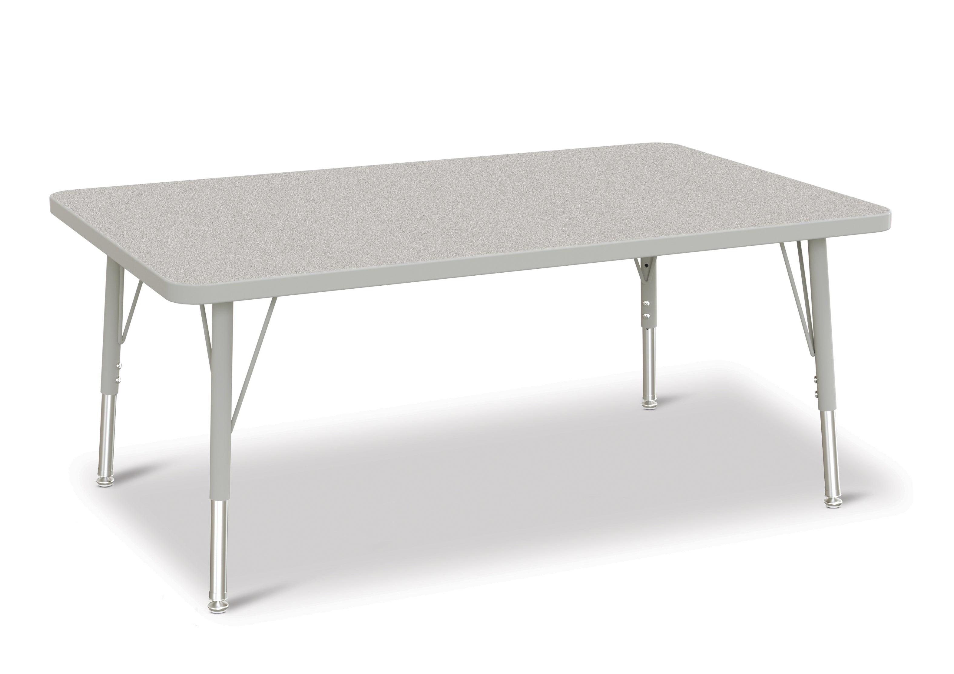 The perfect table for any occasion. Accommodates up to 6 chairs. The legs feature glides that reduce noise, prevent snags, and resist rust. Freckled gray laminate tabletop with gray TRUEdge and gray legs.KYDZSafe edges. KYDZStrong construction. TRUEdge. Choose from multiple tabletop and TRUEdge color combinations. Thermally Fused Laminate tabletops 1-1/8â thick. Quick mount legs with minimal assembly. Legs adjust in one-inch increments with the extra-safe dual-screw leg adjustability system. Helpful Hint: Most children require elementary size tables tiny tables typically fit children just 1 to 2 years old. Adjusts from 15" to 24" high. See cleaning recommendations at www.jonti-craft.com/cleaning.Product Height (inches):15-24Product Width (inches):48Product Depth (inches: 30