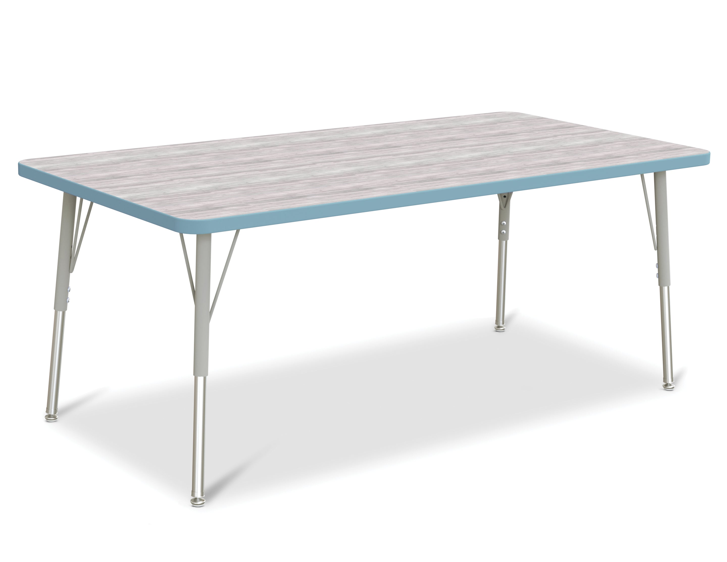 The perfect table for any occasion. Accommodates up to 6 chairs. The legs feature glides that reduce noise, prevent snags, and resist rust. Driftwood Gray tabletop with Coastal Blue TRUEdge and Gray legs.KYDZSafe edges. KYDZStrong construction. TRUEdge. Choose from multiple tabletop and TRUEdge color combinations. Thermally Fused Laminate tabletops 1-1/8â thick. Quick mount legs with minimal assembly. Legs adjust in one-inch increments with the extra-safe dual-screw leg adjustability system. Helpful Hint: Most children require elementary size tables tiny tables typically fit children just 1 to 2 years old. Adjusts from 24" to 31" high. See cleaning recommendations at www.jonti-craft.com/cleaning.Product Height (inches):24-31Product Width (inches):60Product Depth (inches: 30