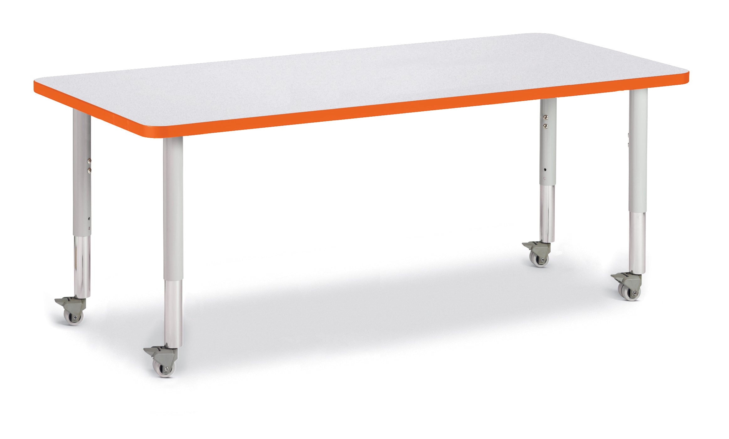 The perfect table for any occasion. Accommodates up to 10 chairs. The legs adjust from 20â to 31â high, are 2â thick, and feature heavy-duty casters. Freckled gray laminate tabletop with orange TRUEdge, gray legs, and gray casters.KYDZSafe edges. KYDZStrong construction. TRUEdge. Choose from multiple tabletop and TRUEdge color combinations. Thermally Fused Laminate tabletops 1-1/8â thick. Quick mount legs with minimal assembly. Legs adjust in one-inch increments with the extra-safe dual-screw leg adjustability system. Helpful Hint: Most children require elementary size tables tiny tables typically fit children just 1 to 2 years old. See cleaning recommendations at www.jonti-craft.com/cleaning.Product Height (inches):20-31Product Width (inches):72Product Depth (inches: 30
