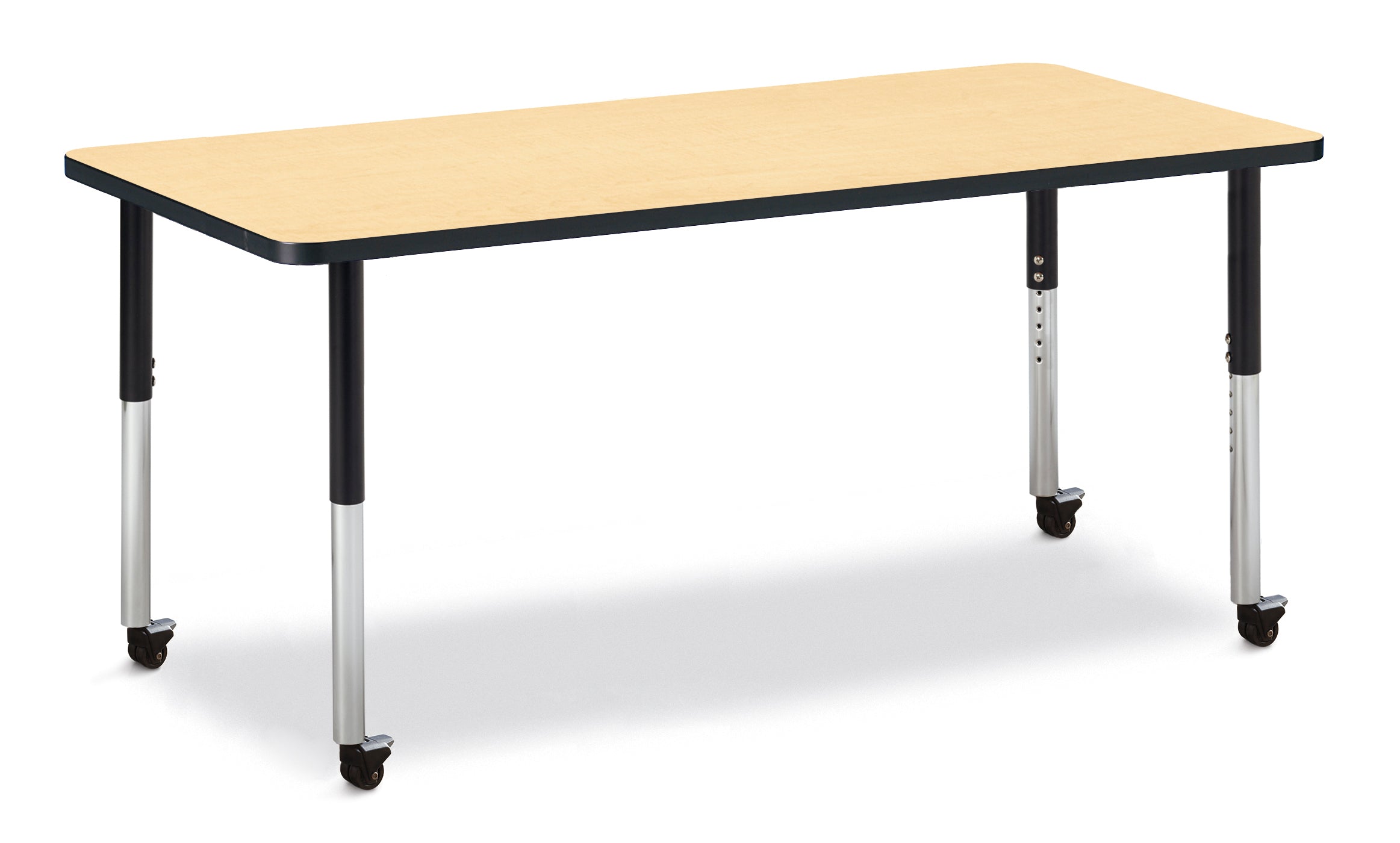 The perfect table for any occasion. Accommodates up to 10 chairs. The legs adjust from 20â to 31â high, are 2â thick, and feature heavy-duty casters. Maple tabletop with black TRUEdge, black legs, and black casters.KYDZSafe edges. KYDZStrong construction. TRUEdge. Choose from multiple tabletop and TRUEdge color combinations. Thermally Fused Laminate tabletops 1-1/8â thick. Quick mount legs with minimal assembly. Legs adjust in one-inch increments with the extra-safe dual-screw leg adjustability system. Helpful Hint: Most children require elementary size tables tiny tables typically fit children just 1 to 2 years old. See cleaning recommendations at www.jonti-craft.com/cleaning.Product Height (inches):20-31Product Width (inches):72Product Depth (inches: 30