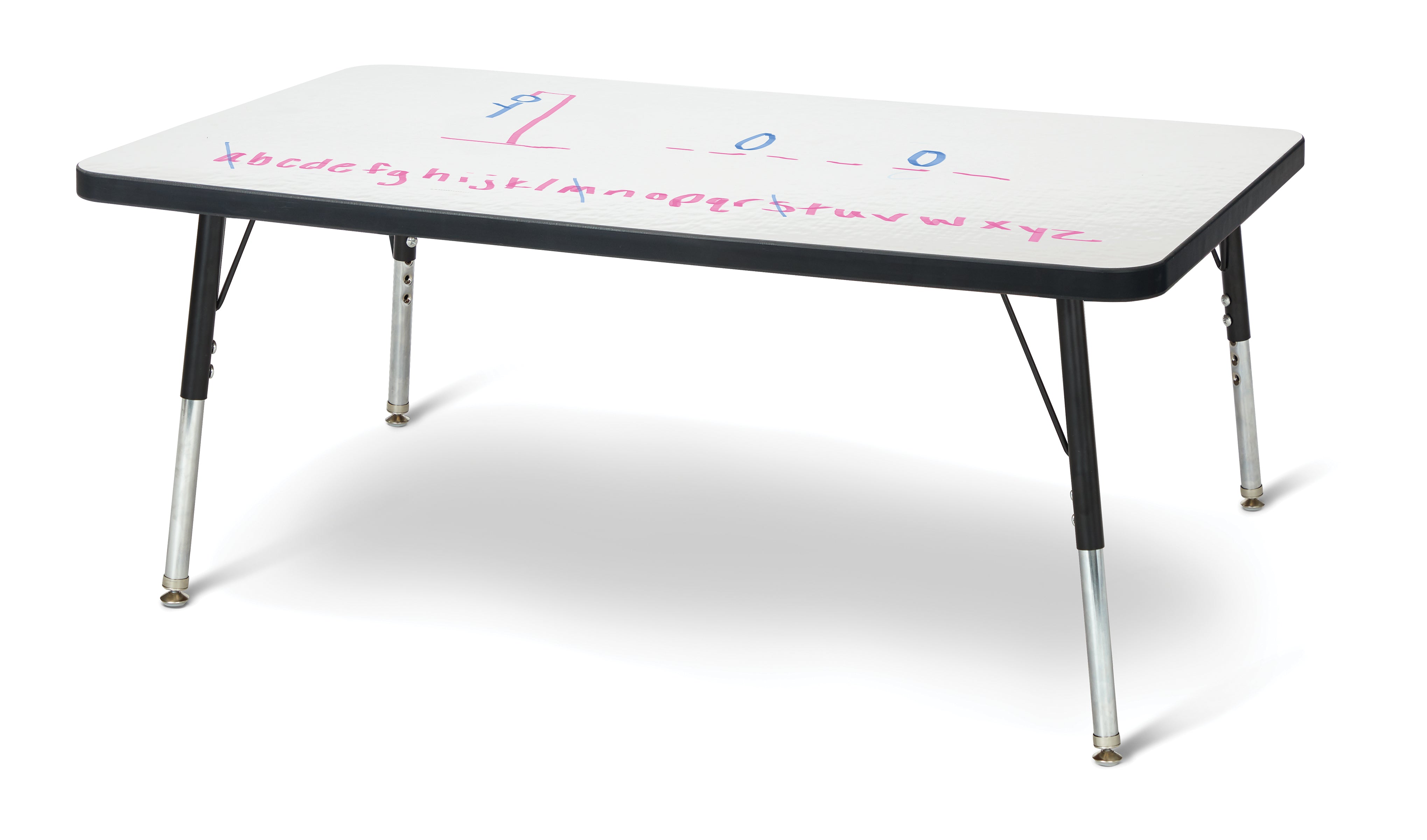 Finally a table where kids can draw directly on it! This markerboard table feature a Write-n-Wipe surface that encourage kids of all ages to get involved. The whiteboard tabletop makes it easy for children to take notes, draw, or even collaborate with others. With a high-pressure laminate surface, you can be sure that the dry erase surface will stand up to some heavy-duty learning. It’s stain resistant and features our famous TRUEdge in a rich black color. Comes with black legs containing glides that reduce noise, prevent snags, and resist rust. Accommodates 2-6 chairs.KYDZSafe edges. KYDZStrong construction. TRUEdge. Quick mount legs with minimal assembly. Available with standard or mobile legs. Upper leg powder coated. Thermally Fused Laminate tabletops 1-1/8â thick. High-pressure laminate Write-n-Wipe surface. Standard legs available in Tiny, Elementary and Adult heights. Helpful Hint: Most children require elementary size tables tiny tables typically fit children just 1 to 2 years old. Adjusts from 15" to 24" high. See cleaning recommendations at www.jonti-craft.com/cleaning.Product Height (inches):15-24Product Width (inches):36Product Depth (inches: 24