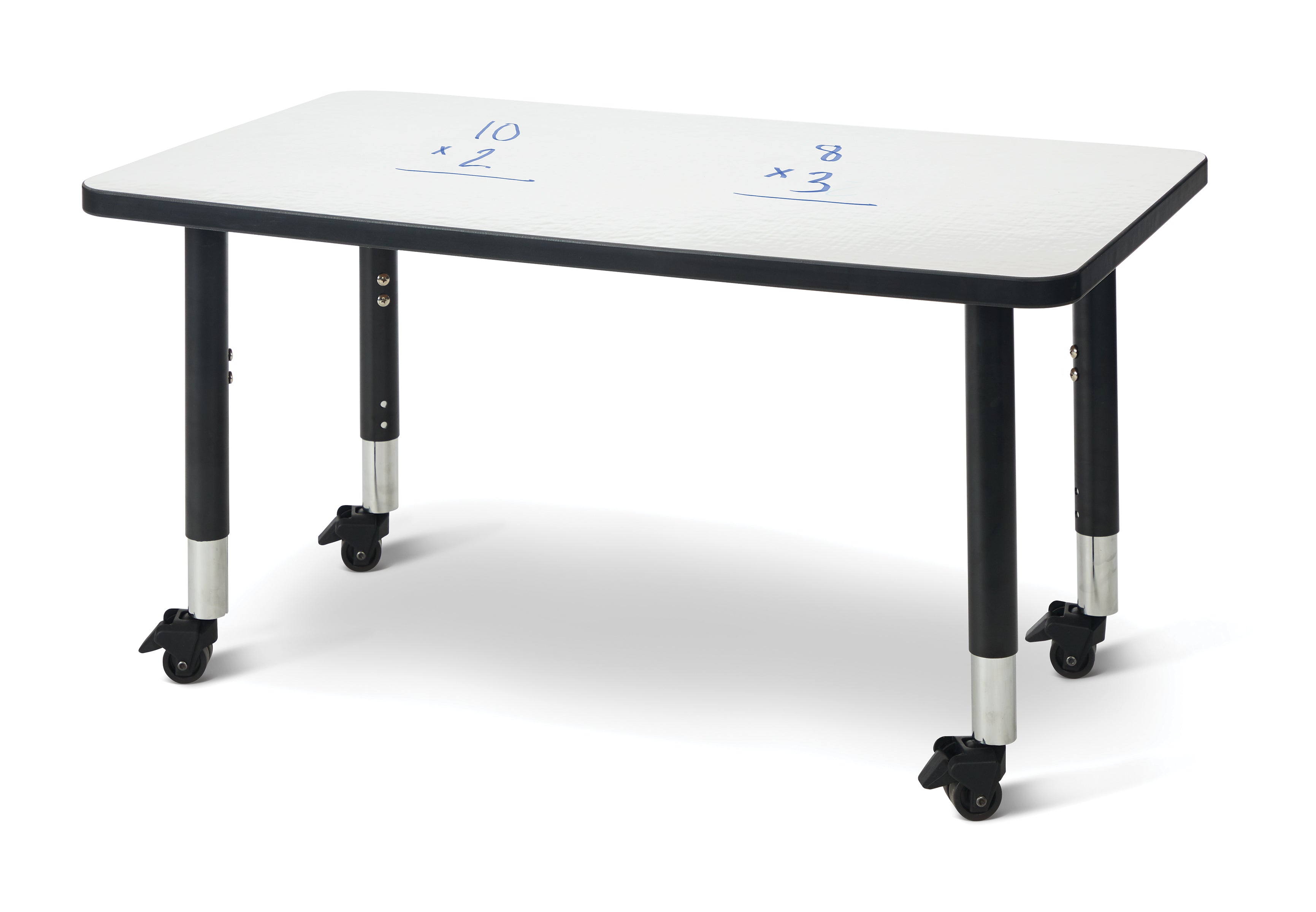 Finally a table where kids can draw directly on it! This markerboard table feature a Write-n-Wipe surface that encourage kids of all ages to get involved. The whiteboard tabletop makes it easy for children to take notes, draw, or even collaborate with others. With a high-pressure laminate surface, you can be sure that the dry erase surface will stand up to some heavy-duty learning. It’s stain resistant and features our famous TRUEdge in a rich black color. Comes with black mobile legs that adjust from 20â to 31â high, are 2â thick, and feature heavy-duty black casters. Accommodates 2 chairs.KYDZSafe edges. KYDZStrong construction. TRUEdge. Quick mount legs with minimal assembly. Available with standard or mobile legs. Upper leg powder coated. Thermally Fused Laminate tabletops 1-1/8â thick. High-pressure laminate Write-n-Wipe surface. Adjusts from 18â to 29â high (or 20â to 31â with casters).Product Height (inches):20-31Product Width (inches):36Product Depth (inches: 24