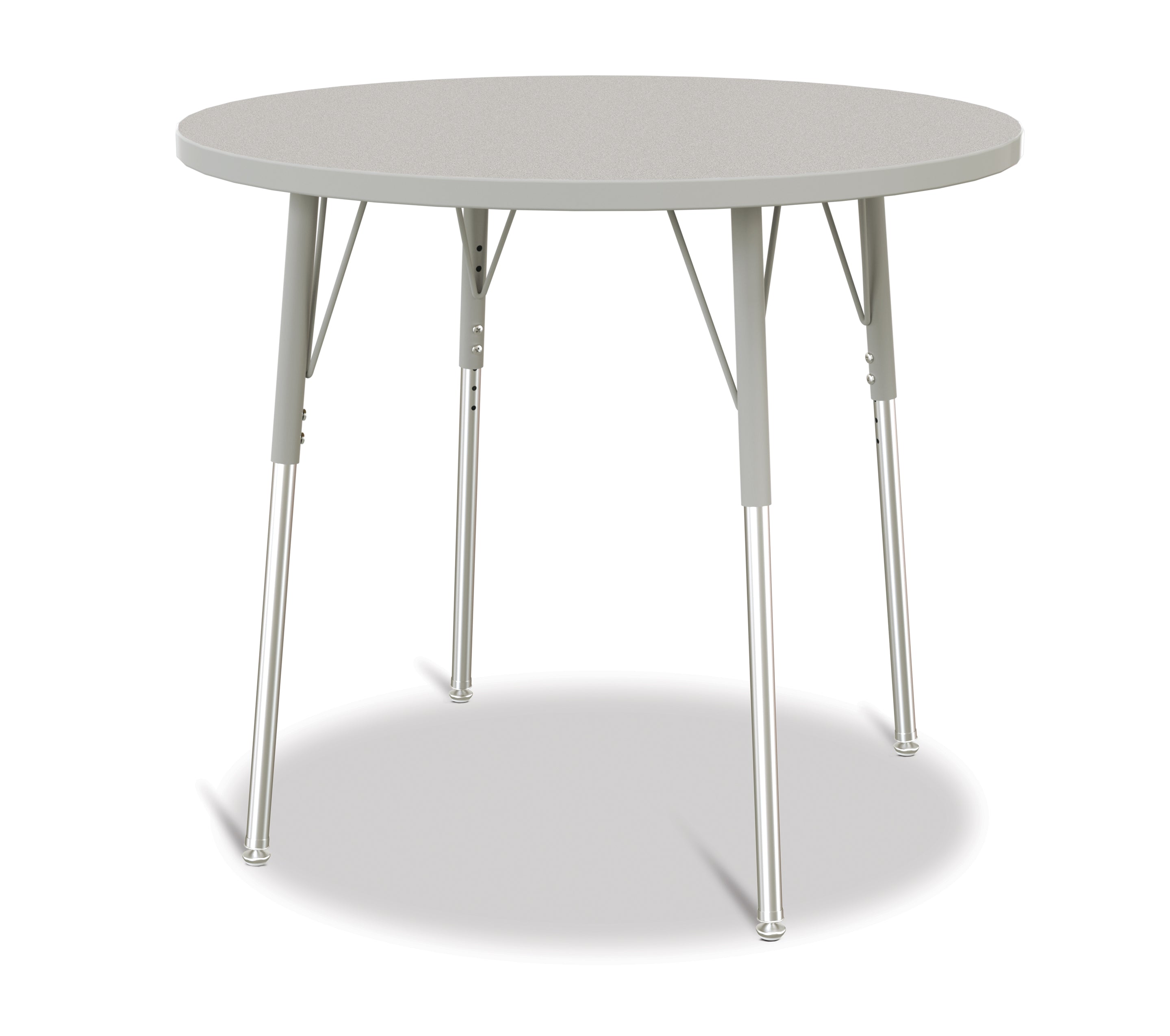 These round tables are excellent for allowing children to interact with each other during projects. Accommodates up to 4 chairs. The legs feature glides that reduce noise, prevent snags, and resist rust. Freckled gray laminate tabletop with gray TRUEdge and gray legs.KYDZSafe edges. KYDZStrong construction. TRUEdge. Choose from multiple tabletop and TRUEdge color combinations. Thermally Fused Laminate tabletops 1-1/8â thick. Quick mount legs with minimal assembly. Legs adjust in one-inch increments with the extra-safe dual-screw leg adjustability system. Helpful Hint: Most children require elementary size tables tiny tables typically fit children just 1 to 2 years old. Adjusts from 24" to 31" high. See cleaning recommendations at www.jonti-craft.com/cleaning.Product Height (inches):24-31Product Width (inches):36Product Depth (inches: 36