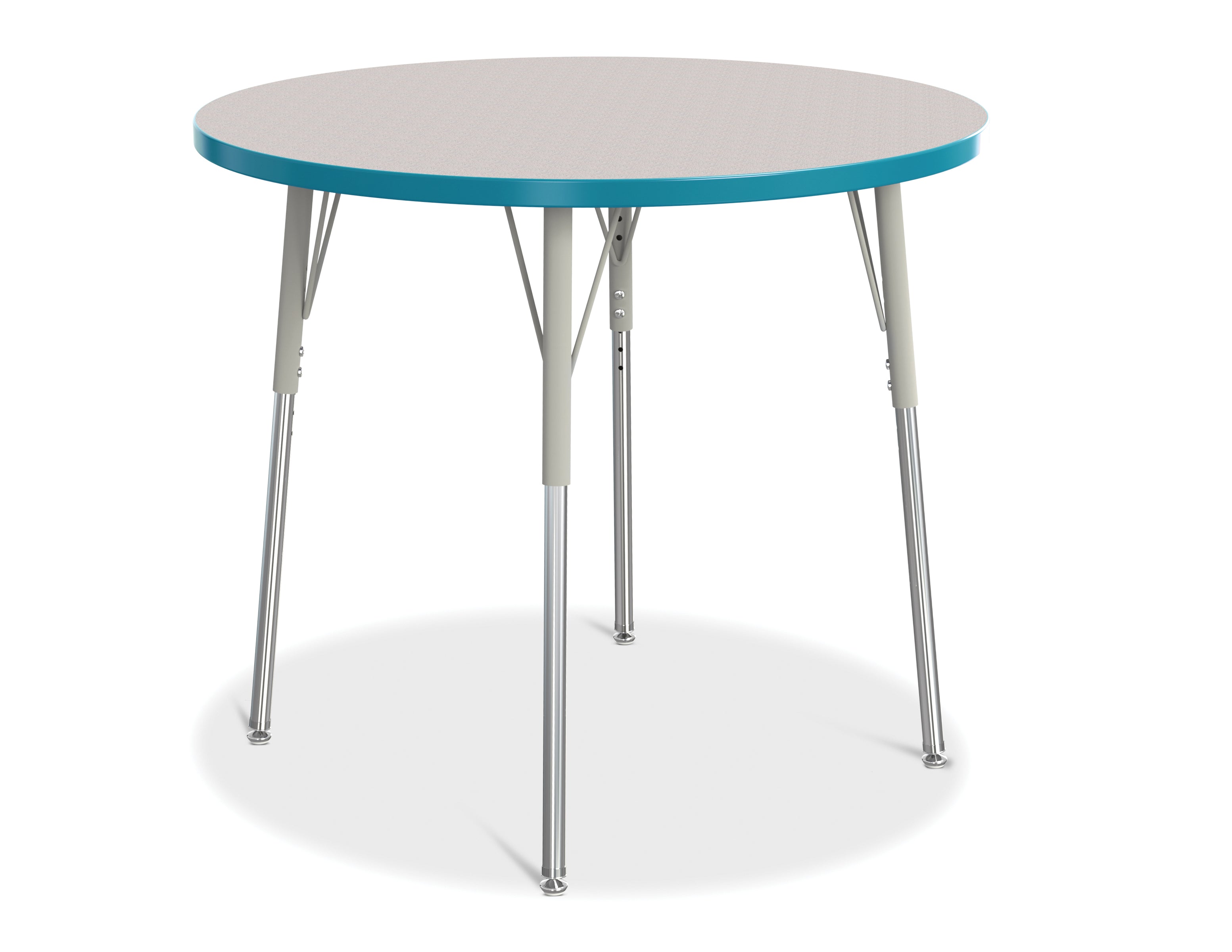 These round tables are excellent for allowing children to interact with each other during projects. Accommodates up to 4 chairs. The legs feature glides that reduce noise, prevent snags, and resist rust. Freckled gray laminate tabletop with teal TRUEdge and gray legs.KYDZSafe edges. KYDZStrong construction. TRUEdge. Choose from multiple tabletop and TRUEdge color combinations. Thermally Fused Laminate tabletops 1-1/8â thick. Quick mount legs with minimal assembly. Legs adjust in one-inch increments with the extra-safe dual-screw leg adjustability system. Helpful Hint: Most children require elementary size tables tiny tables typically fit children just 1 to 2 years old. Adjusts from 24" to 31" high. See cleaning recommendations at www.jonti-craft.com/cleaning.Product Height (inches):24-31Product Width (inches):36Product Depth (inches: 36