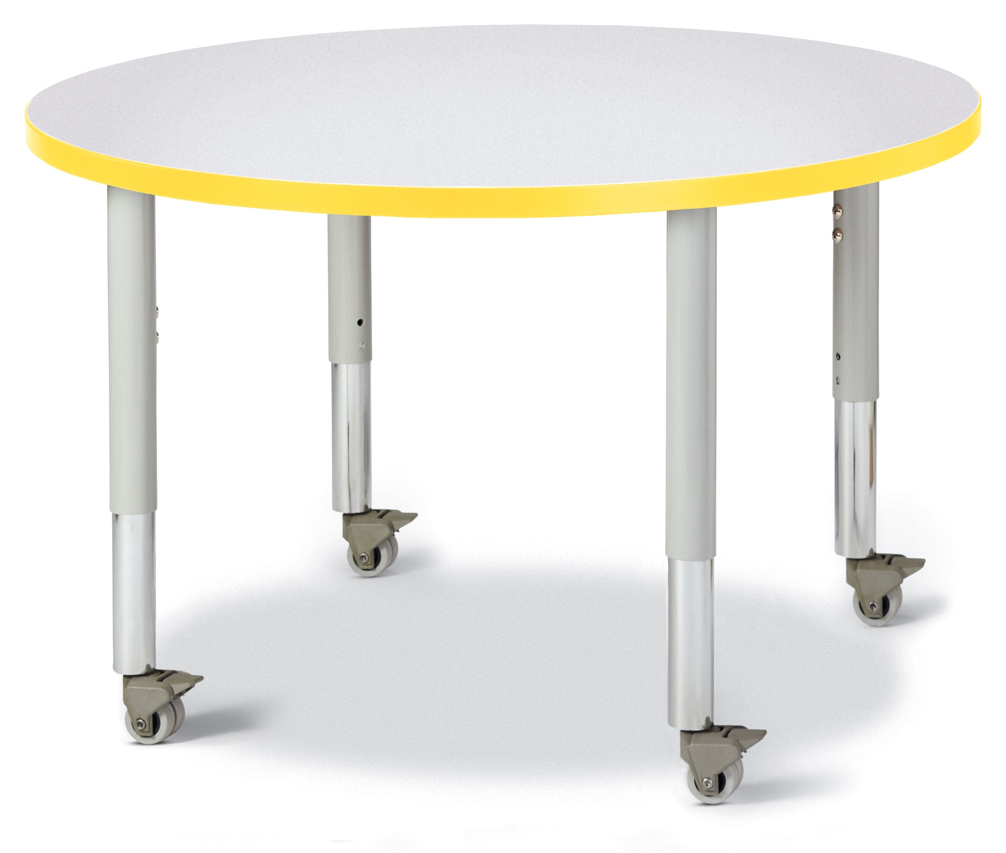 These round tables are excellent for allowing children to interact with each other during projects. Accommodates up to 4 chairs. The legs adjust from 20â to 31â high, are 2â thick, and feature heavy-duty casters. Freckled gray laminate tabletop with yellow TRUEdge, gray legs, and gray casters.KYDZSafe edges. KYDZStrong construction. TRUEdge. Choose from multiple tabletop and TRUEdge color combinations. Thermally Fused Laminate tabletops 1-1/8â thick. Quick mount legs with minimal assembly. Legs adjust in one-inch increments with the extra-safe dual-screw leg adjustability system. Helpful Hint: Most children require elementary size tables tiny tables typically fit children just 1 to 2 years old. See cleaning recommendations at www.jonti-craft.com/cleaning.Product Height (inches):20-31Product Width (inches):36Product Depth (inches: 36