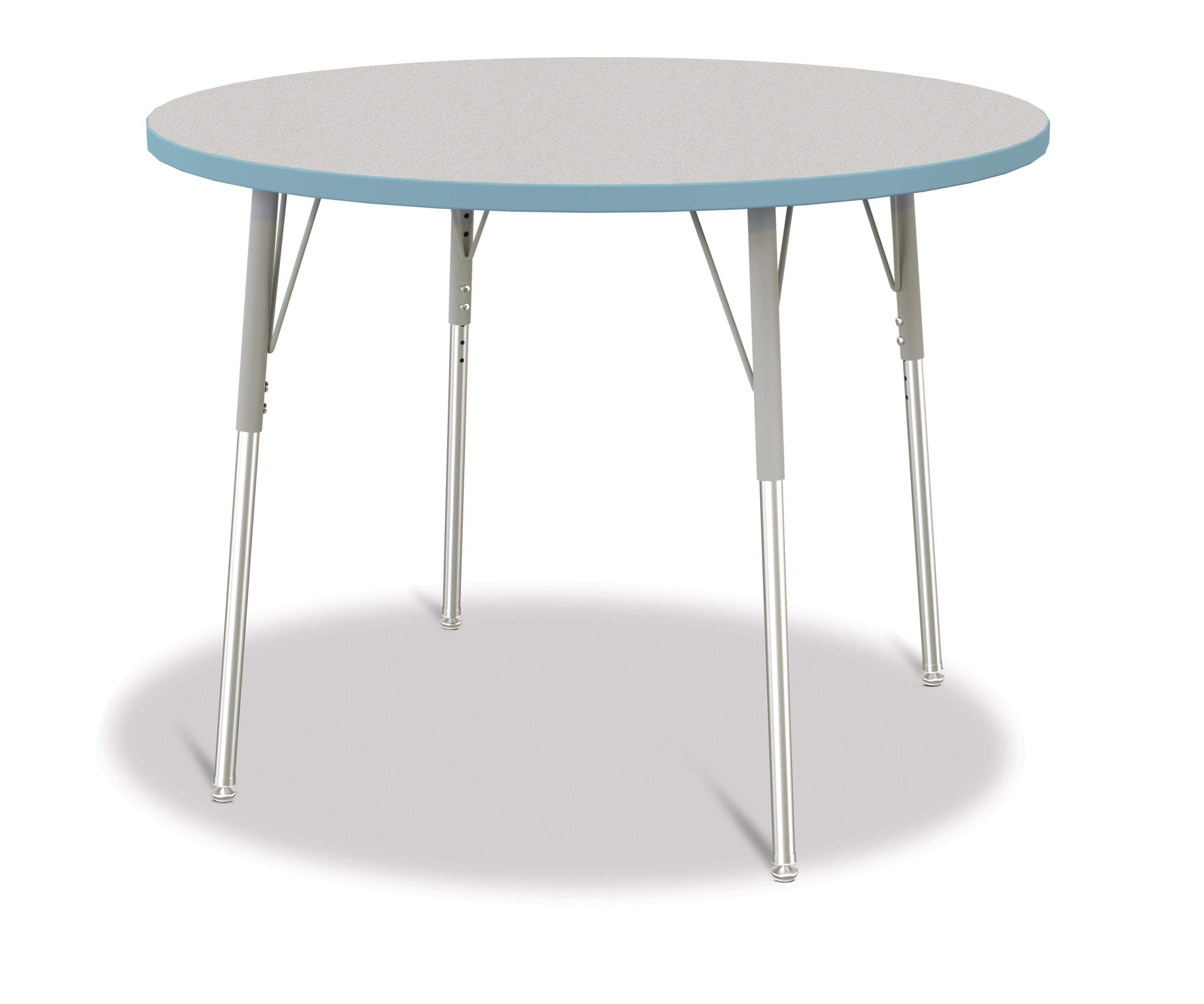 These round tables are excellent for allowing children to interact with each other during projects. Accommodates up to 4 chairs. The legs feature glides that reduce noise, prevent snags, and resist rust. Freckled gray laminate tabletop with coastal blue TRUEdge and gray legs.KYDZSafe edges. KYDZStrong construction. TRUEdge. Choose from multiple tabletop and TRUEdge color combinations. Thermally Fused Laminate tabletops 1-1/8â thick. Quick mount legs with minimal assembly. Legs adjust in one-inch increments with the extra-safe dual-screw leg adjustability system. Helpful Hint: Most children require elementary size tables tiny tables typically fit children just 1 to 2 years old. Adjusts from 24" to 31" high. See cleaning recommendations at www.jonti-craft.com/cleaning.Product Height (inches):24-31Product Width (inches):42Product Depth (inches: 42