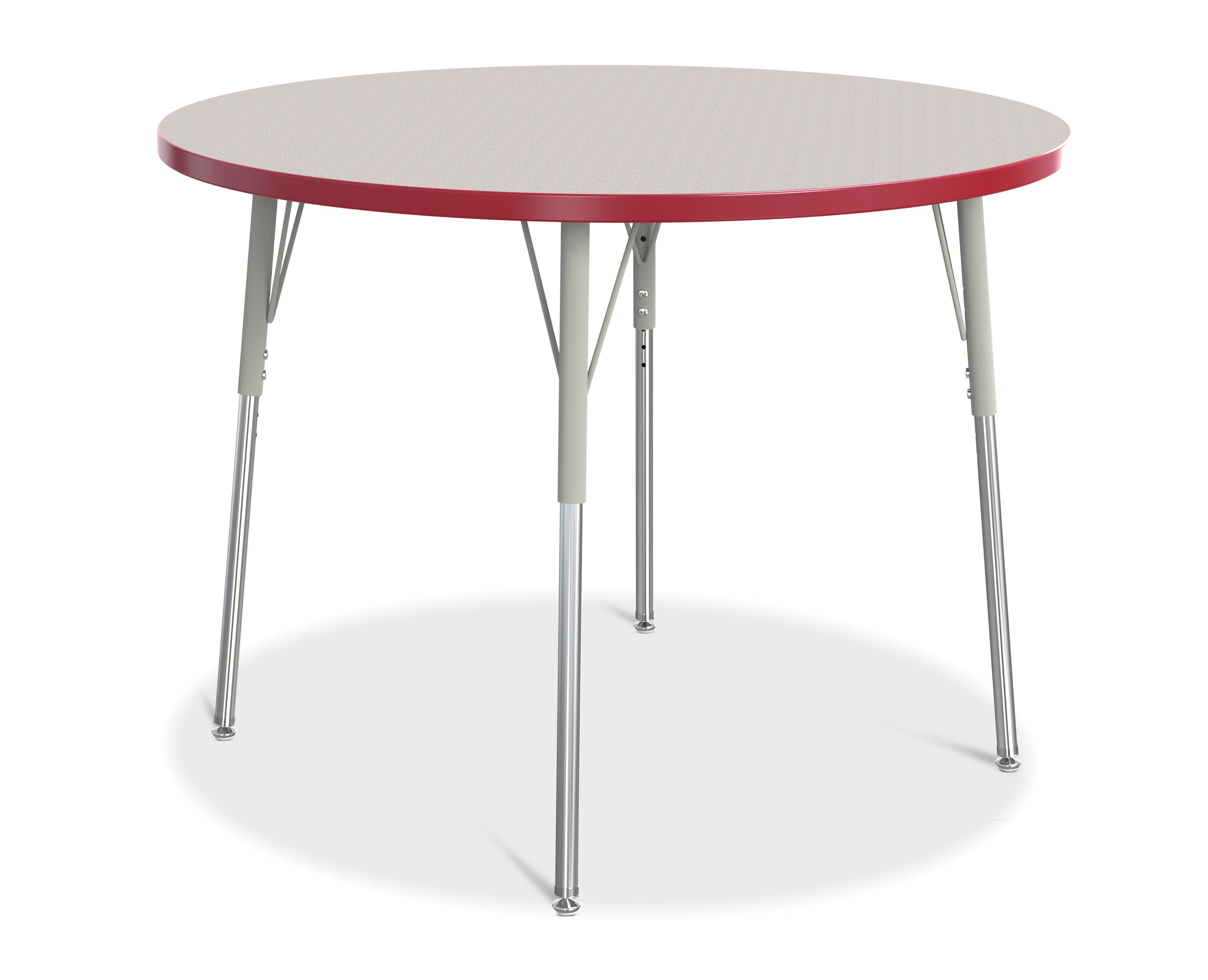 These round tables are excellent for allowing children to interact with each other during projects. Accommodates up to 4 chairs. The legs feature glides that reduce noise, prevent snags, and resist rust. Freckled gray laminate tabletop with red TRUEdge and gray legs.KYDZSafe edges. KYDZStrong construction. TRUEdge. Choose from multiple tabletop and TRUEdge color combinations. Thermally Fused Laminate tabletops 1-1/8â thick. Quick mount legs with minimal assembly. Legs adjust in one-inch increments with the extra-safe dual-screw leg adjustability system. Helpful Hint: Most children require elementary size tables tiny tables typically fit children just 1 to 2 years old. Adjusts from 24" to 31" high. See cleaning recommendations at www.jonti-craft.com/cleaning.Product Height (inches):24-31Product Width (inches):42Product Depth (inches: 42