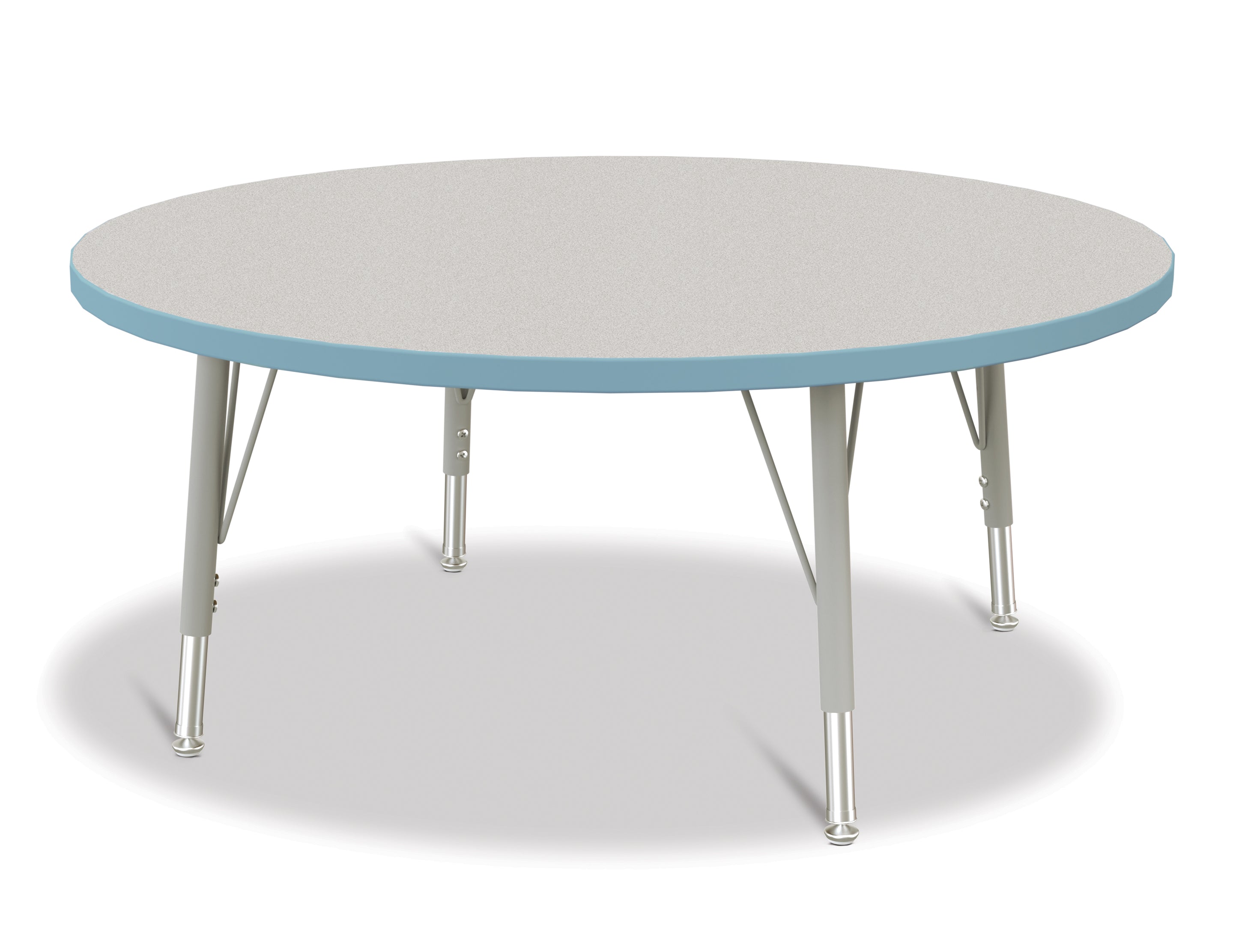 These round tables are excellent for allowing children to interact with each other during projects. Accommodates up to 6 chairs. The legs feature glides that reduce noise, prevent snags, and resist rust. Freckled gray laminate tabletop with green TRUEdge and gray legs.KYDZSafe edges. KYDZStrong construction. TRUEdge. Choose from multiple tabletop and TRUEdge color combinations. Thermally Fused Laminate tabletops 1-1/8â thick. Quick mount legs with minimal assembly. Legs adjust in one-inch increments with the extra-safe dual-screw leg adjustability system. Helpful Hint: Most children require elementary size tables tiny tables typically fit children just 1 to 2 years old. Adjusts from 15" to 24" high. See cleaning recommendations at www.jonti-craft.com/cleaning.Product Height (inches):15-24Product Width (inches):42Product Depth (inches: 42