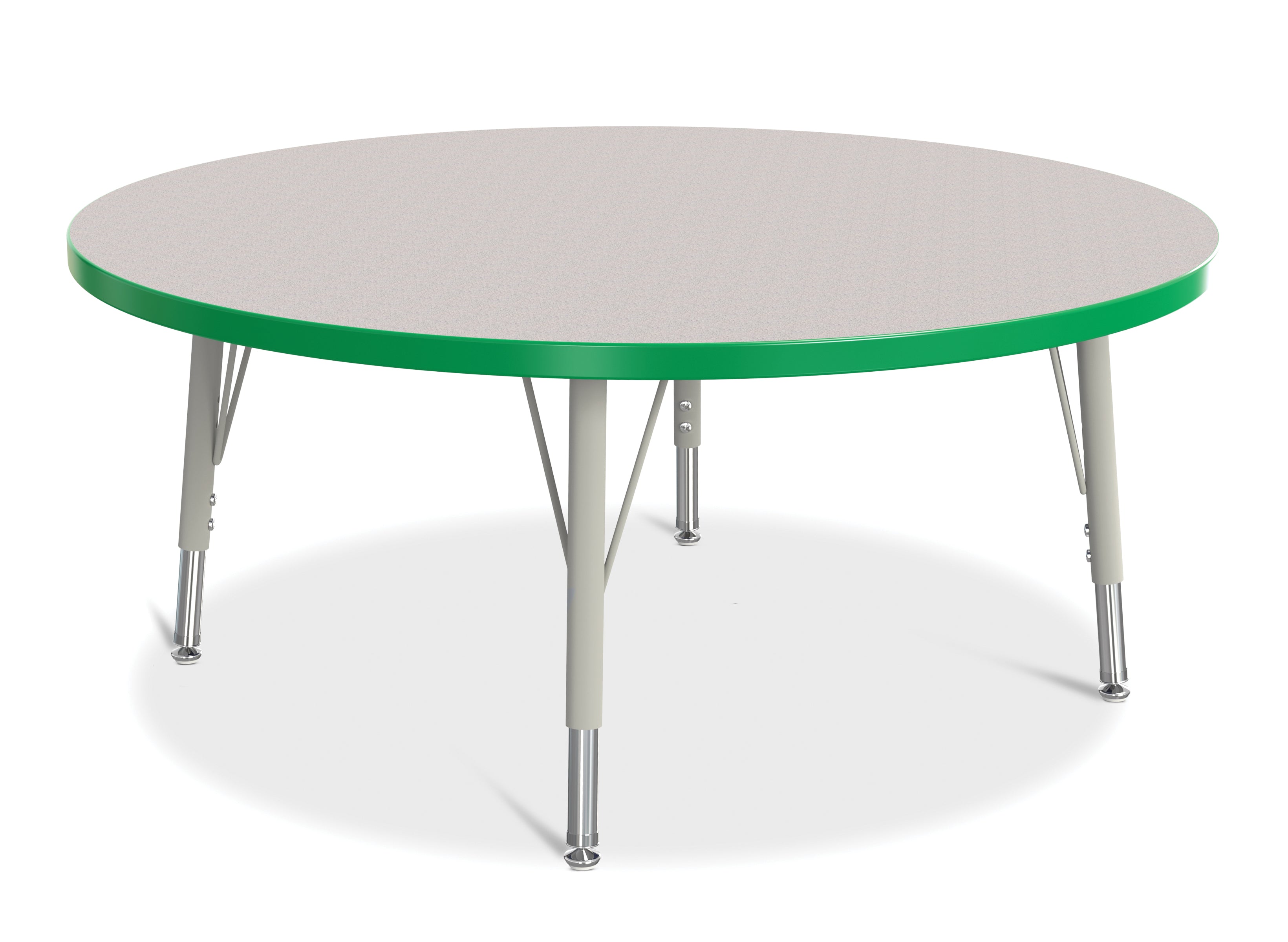 These round tables are excellent for allowing children to interact with each other during projects. Accommodates up to 6 chairs. The legs feature glides that reduce noise, prevent snags, and resist rust. Freckled gray laminate tabletop with green TRUEdge and gray legs.KYDZSafe edges. KYDZStrong construction. TRUEdge. Choose from multiple tabletop and TRUEdge color combinations. Thermally Fused Laminate tabletops 1-1/8â thick. Quick mount legs with minimal assembly. Legs adjust in one-inch increments with the extra-safe dual-screw leg adjustability system. Helpful Hint: Most children require elementary size tables tiny tables typically fit children just 1 to 2 years old. Adjusts from 15" to 24" high. See cleaning recommendations at www.jonti-craft.com/cleaning.Product Height (inches):15-24Product Width (inches):42Product Depth (inches: 42