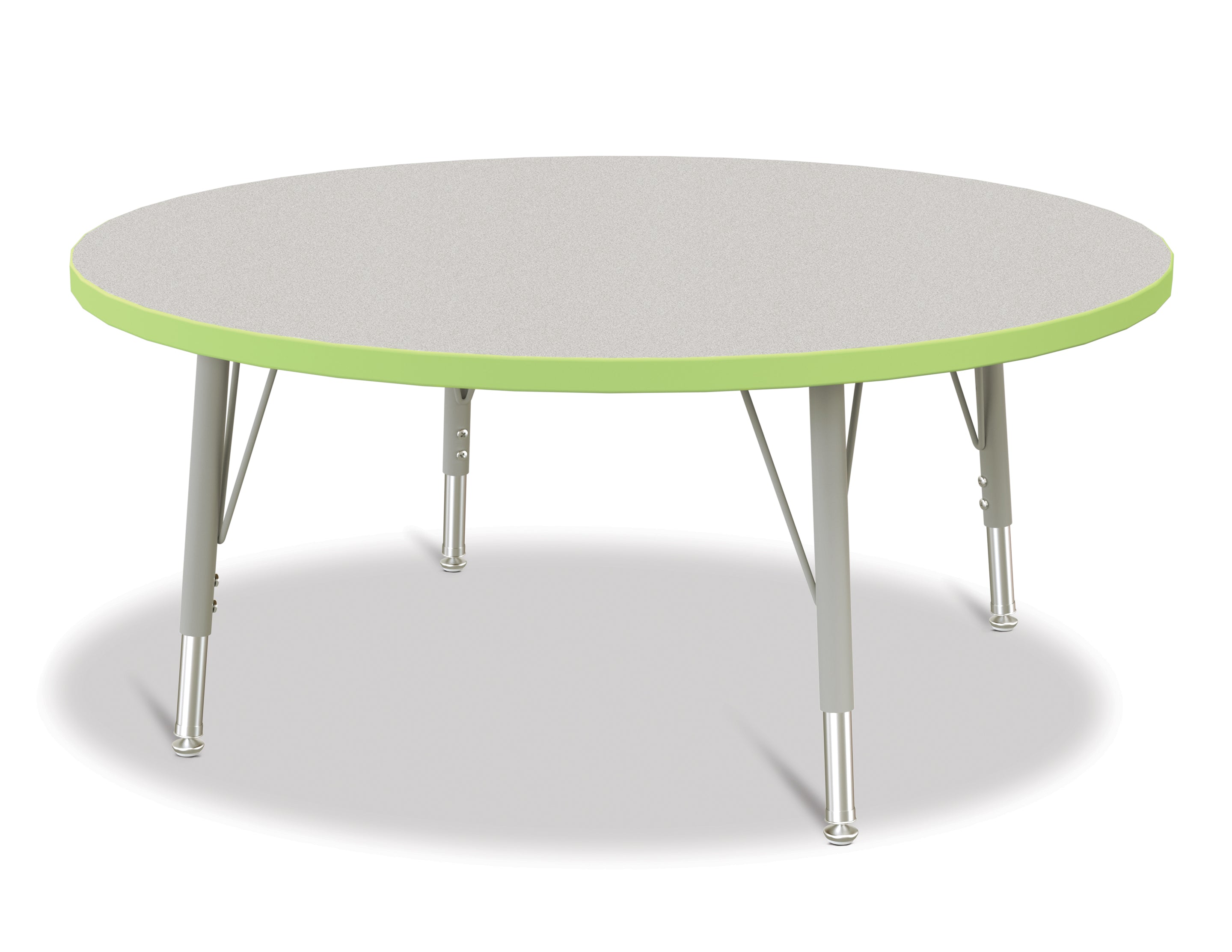 These round tables are excellent for allowing children to interact with each other during projects. Accommodates up to 6 chairs. The legs feature glides that reduce noise, prevent snags, and resist rust. Freckled gray laminate tabletop with key lime green TRUEdge and gray legs.KYDZSafe edges. KYDZStrong construction. TRUEdge. Choose from multiple tabletop and TRUEdge color combinations. Thermally Fused Laminate tabletops 1-1/8â thick. Quick mount legs with minimal assembly. Legs adjust in one-inch increments with the extra-safe dual-screw leg adjustability system. Helpful Hint: Most children require elementary size tables tiny tables typically fit children just 1 to 2 years old. Adjusts from 15" to 24" high. See cleaning recommendations at www.jonti-craft.com/cleaning.Product Height (inches):15-24Product Width (inches):42Product Depth (inches: 42