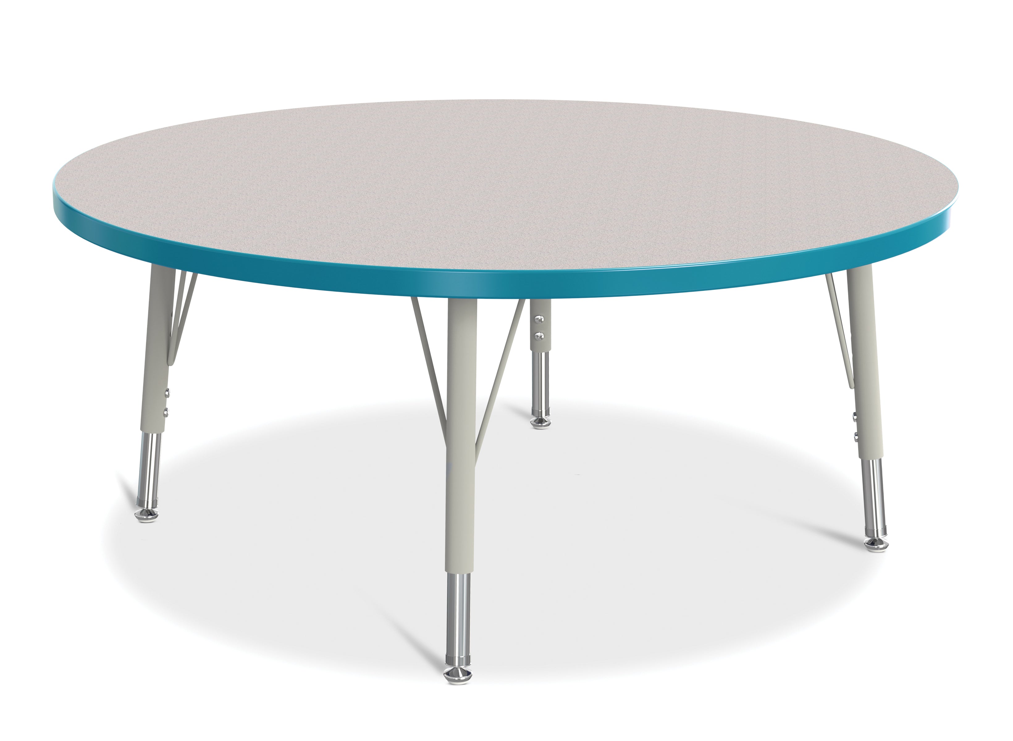 These round tables are excellent for allowing children to interact with each other during projects. Accommodates up to 6 chairs. The legs feature glides that reduce noise, prevent snags, and resist rust. Freckled gray laminate tabletop with teal TRUEdge and gray legs.KYDZSafe edges. KYDZStrong construction. TRUEdge. Choose from multiple tabletop and TRUEdge color combinations. Thermally Fused Laminate tabletops 1-1/8â thick. Quick mount legs with minimal assembly. Legs adjust in one-inch increments with the extra-safe dual-screw leg adjustability system. Helpful Hint: Most children require elementary size tables tiny tables typically fit children just 1 to 2 years old. Adjusts from 15" to 24" high. See cleaning recommendations at www.jonti-craft.com/cleaning.Product Height (inches):15-24Product Width (inches):42Product Depth (inches: 42