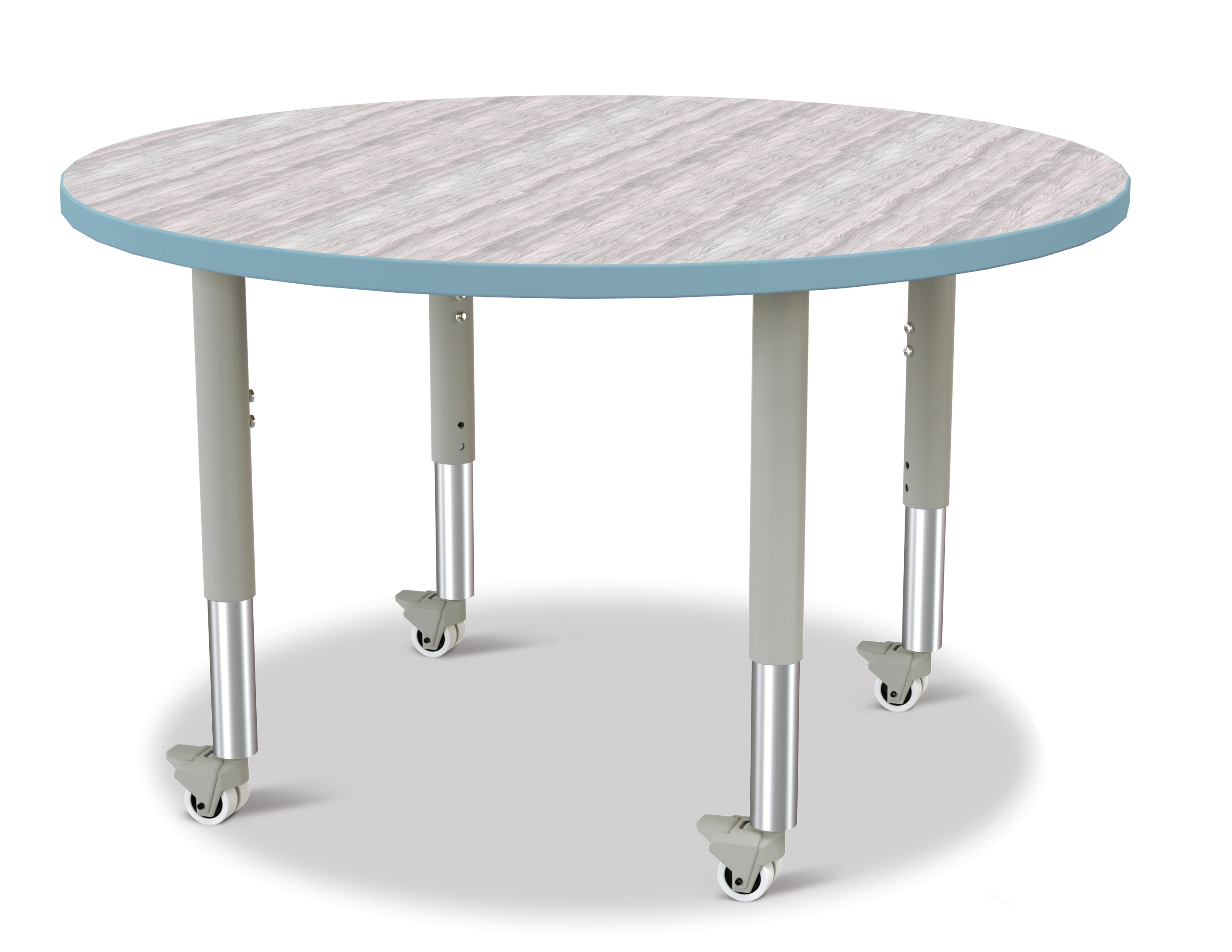These round tables are excellent for allowing children to interact with each other during projects. Accommodates up to 6 chairs. The legs adjust from 20â to 31â high, are 2â thick, and feature heavy-duty casters. Driftwood Gray laminate tabletop with Coastal Blue TRUEdge, gray legs, and gray casters.KYDZSafe edges. KYDZStrong construction. TRUEdge. Choose from multiple tabletop and TRUEdge color combinations. Thermally Fused Laminate tabletops 1-1/8â thick. Quick mount legs with minimal assembly. Legs adjust in one-inch increments with the extra-safe dual-screw leg adjustability system. Helpful Hint: Most children require elementary size tables tiny tables typically fit children just 1 to 2 years old. Adjusts from 18â to 29â high (or 20â to 31â with casters). See cleaning recommendations at www.jonti-craft.com/cleaning.Product Height (inches):20-31Product Width (inches):42Product Depth (inches: 42