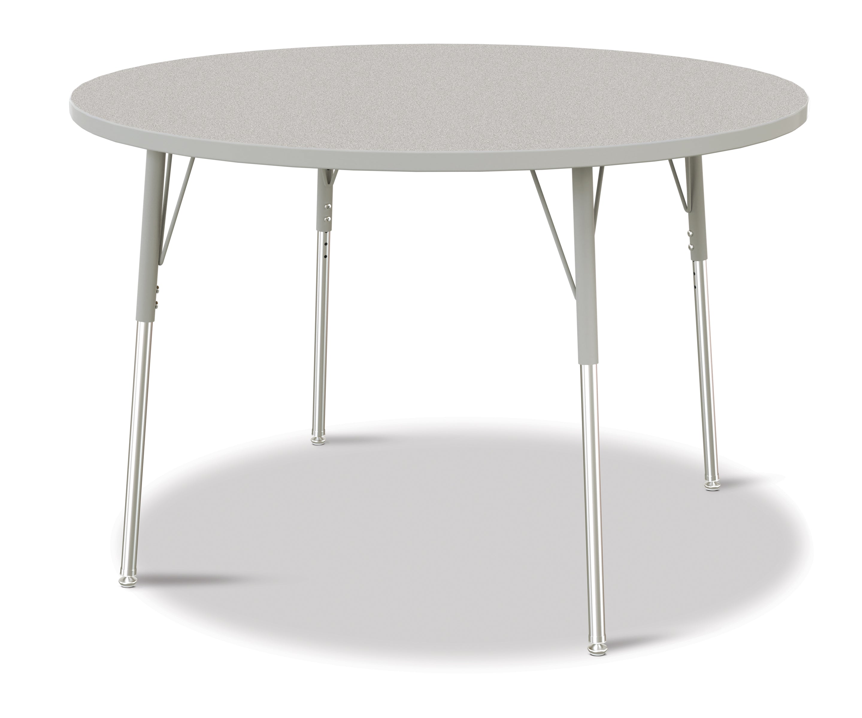 These round tables are excellent for allowing children to interact with each other during projects. Accommodates up to 6 chairs. The legs feature glides that reduce noise, prevent snags, and resist rust. Freckled gray laminate tabletop with gray TRUEdge and gray legs.KYDZSafe edges. KYDZStrong construction. TRUEdge. Choose from multiple tabletop and TRUEdge color combinations. Thermally Fused Laminate tabletops 1-1/8â thick. Quick mount legs with minimal assembly. Legs adjust in one-inch increments with the extra-safe dual-screw leg adjustability system. Helpful Hint: Most children require elementary size tables tiny tables typically fit children just 1 to 2 years old. Adjusts from 24" to 31" high. See cleaning recommendations at www.jonti-craft.com/cleaning.Product Height (inches):24-31Product Width (inches):48Product Depth (inches: 48