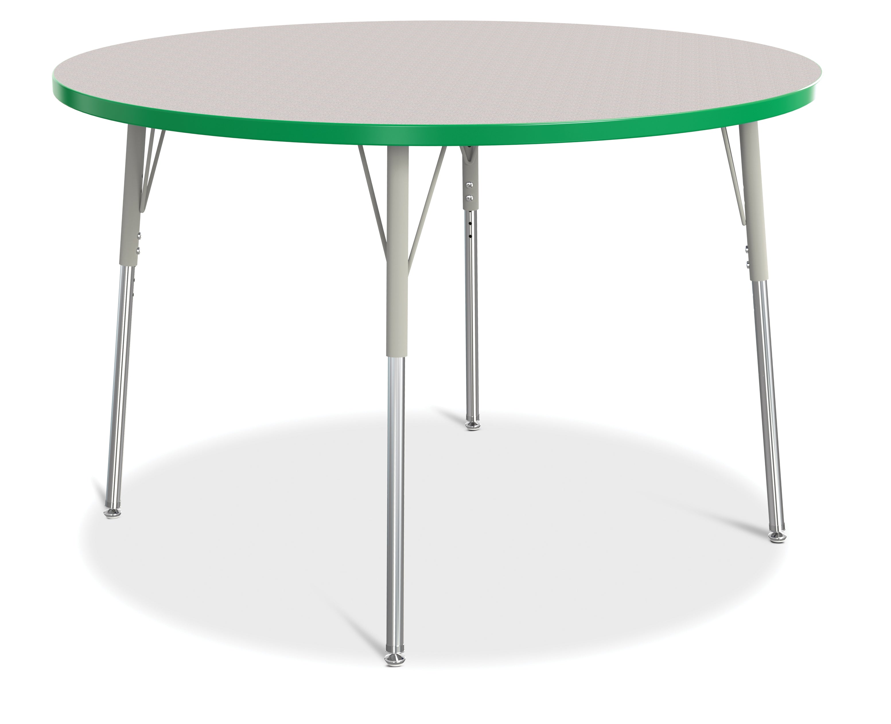 These round tables are excellent for allowing children to interact with each other during projects. Accommodates up to 6 chairs. The legs feature glides that reduce noise, prevent snags, and resist rust. Freckled gray laminate tabletop with green TRUEdge and gray legs.KYDZSafe edges. KYDZStrong construction. TRUEdge. Choose from multiple tabletop and TRUEdge color combinations. Thermally Fused Laminate tabletops 1-1/8â thick. Quick mount legs with minimal assembly. Legs adjust in one-inch increments with the extra-safe dual-screw leg adjustability system. Helpful Hint: Most children require elementary size tables tiny tables typically fit children just 1 to 2 years old. Adjusts from 24" to 31" high. See cleaning recommendations at www.jonti-craft.com/cleaning.Product Height (inches):24-31Product Width (inches):48Product Depth (inches: 48