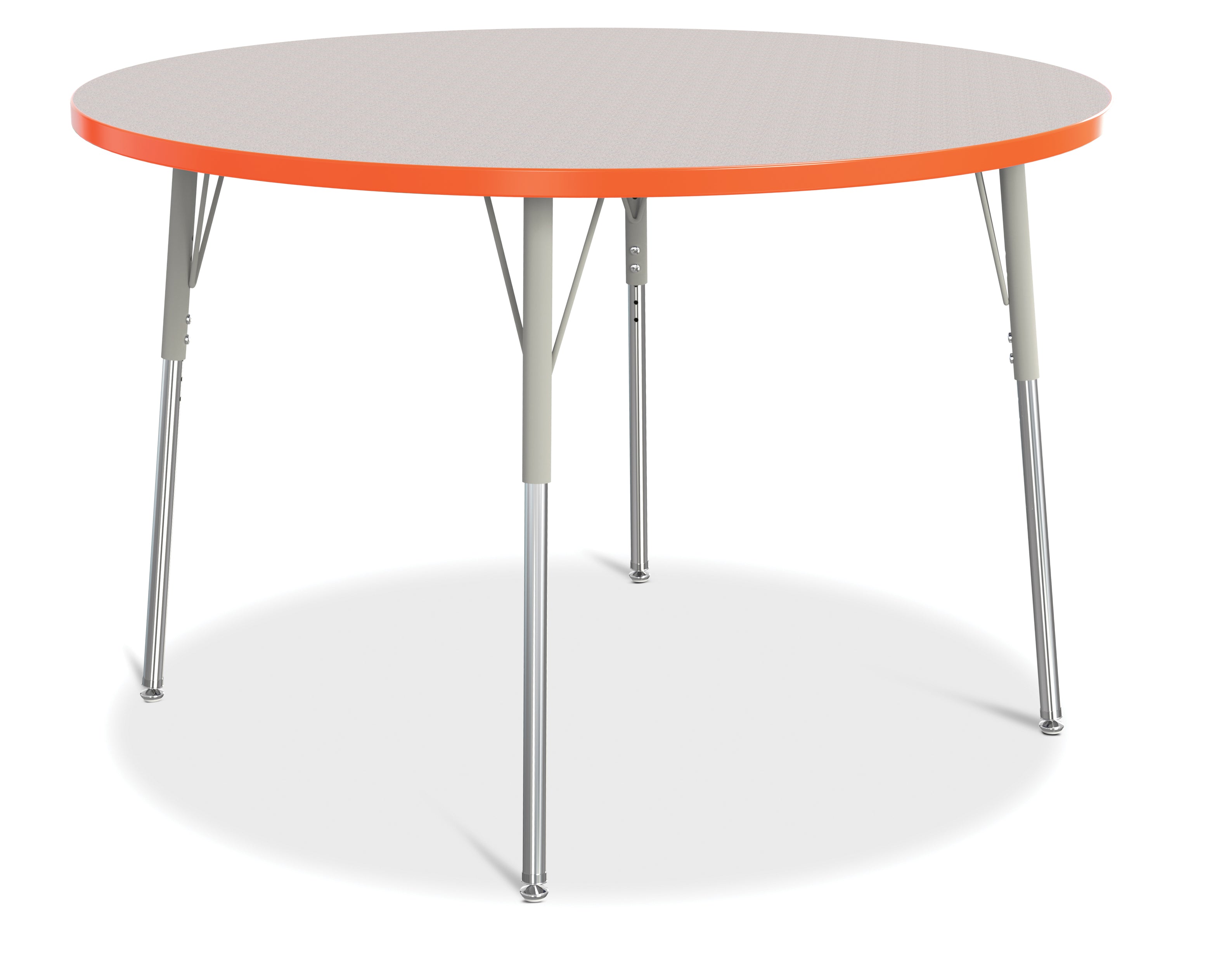 These round tables are excellent for allowing children to interact with each other during projects. Accommodates up to 6 chairs. The legs feature glides that reduce noise, prevent snags, and resist rust. Freckled gray laminate tabletop with orange TRUEdge and gray legs.KYDZSafe edges. KYDZStrong construction. TRUEdge. Choose from multiple tabletop and TRUEdge color combinations. Thermally Fused Laminate tabletops 1-1/8â thick. Quick mount legs with minimal assembly. Legs adjust in one-inch increments with the extra-safe dual-screw leg adjustability system. Helpful Hint: Most children require elementary size tables tiny tables typically fit children just 1 to 2 years old. Adjusts from 24" to 31" high. See cleaning recommendations at www.jonti-craft.com/cleaning.Product Height (inches):24-31Product Width (inches):48Product Depth (inches: 48