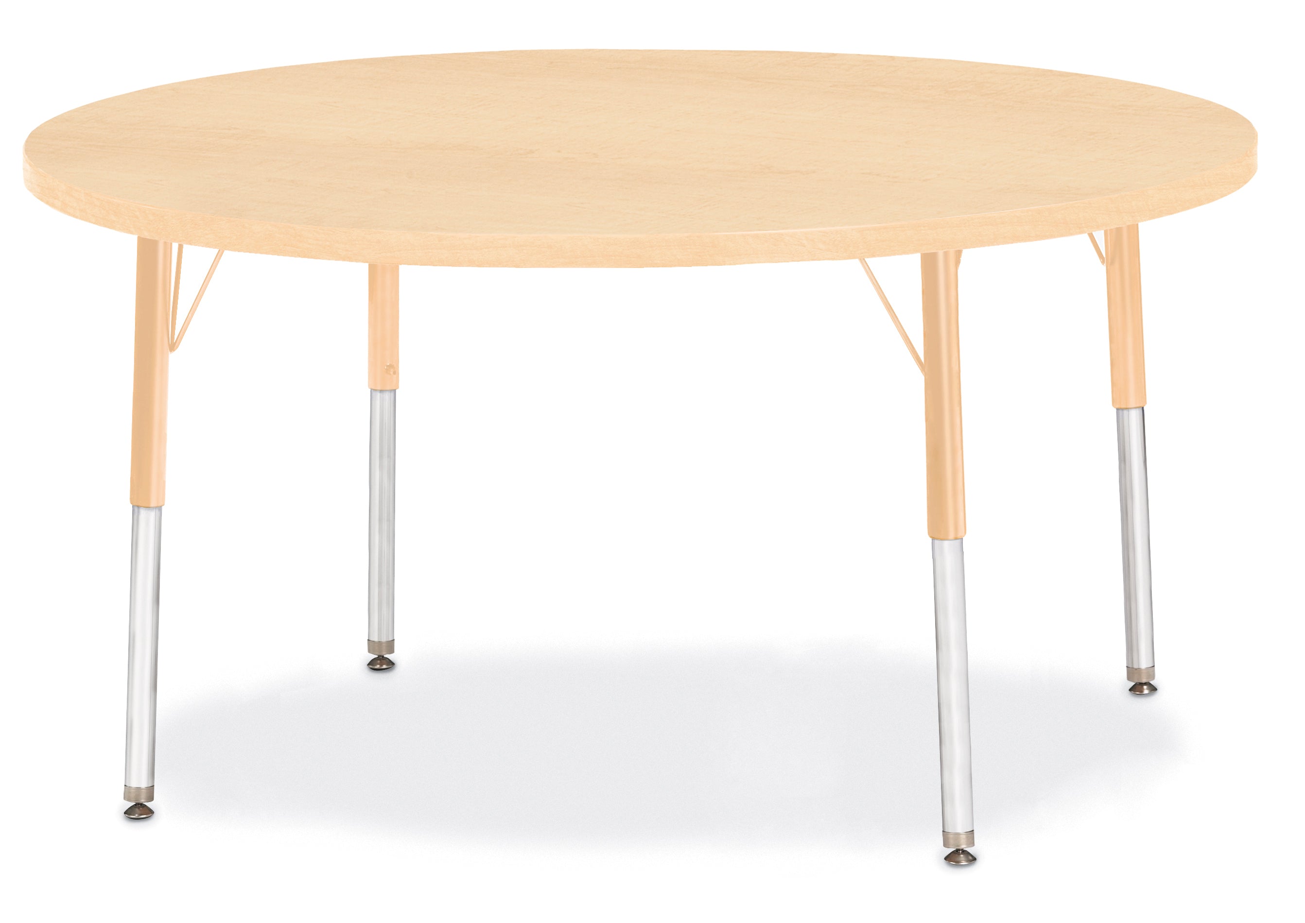These round tables are excellent for allowing children to interact with each other during projects. Accommodates up to 6 chairs. The legs feature glides that reduce noise, prevent snags, and resist rust. Maple tabletop with maple TRUEdge and camel legs.KYDZSafe edges. KYDZStrong construction. TRUEdge. Choose from multiple tabletop and TRUEdge color combinations. Thermally Fused Laminate tabletops 1-1/8â thick. Quick mount legs with minimal assembly. Legs adjust in one-inch increments with the extra-safe dual-screw leg adjustability system. Helpful Hint: Most children require elementary size tables tiny tables typically fit children just 1 to 2 years old. Adjusts from 24" to 31" high. See cleaning recommendations at www.jonti-craft.com/cleaning.Product Height (inches):24-31Product Width (inches):48Product Depth (inches: 48