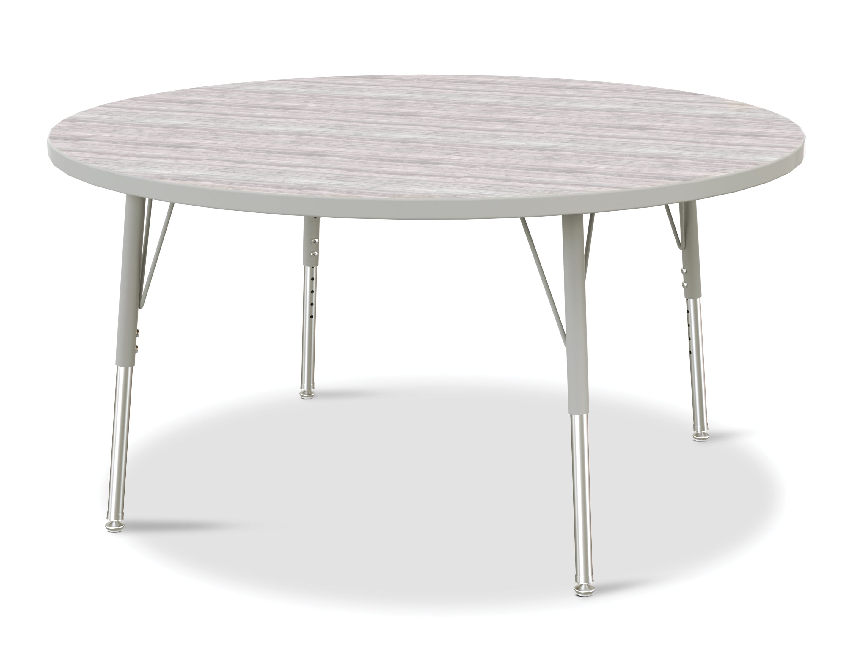These round tables are excellent for allowing children to interact with each other during projects. Accommodates up to 8 chairs. The legs feature glides that reduce noise, prevent snags, and resist rust. Driftwood Gray laminate tabletop with Gray TRUEdge and gray legs.KYDZSafe edges. KYDZStrong construction. TRUEdge. Choose from multiple tabletop and TRUEdge color combinations. Thermally Fused Laminate tabletops 1-1/8â thick. Quick mount legs with minimal assembly. Legs adjust in one-inch increments with the extra-safe dual-screw leg adjustability system. Helpful Hint: Most children require elementary size tables tiny tables typically fit children just 1 to 2 years old. Adjusts from 15" to 24" high. See cleaning recommendations at www.jonti-craft.com/cleaning.Product Height (inches):15-24Product Width (inches):48Product Depth (inches: 48